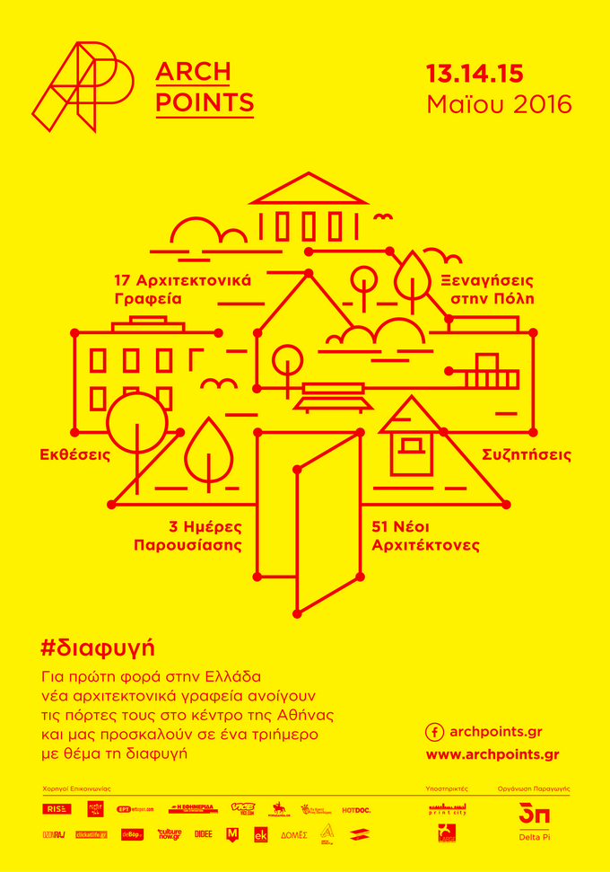Το Σάββατο 14/5 και την Κυριακή 15/5, από τις 11:00 έως τις 19:00 όλα τα γραφεία που συμμετέχουν στο Arch Points 2016 θα έχουν ανοιχτές τις πόρτες τους και θα υποδέχονται το κοινό. Οι επισκέπτες των γραφείων θα έχουν τη δυνατότητα να έρθουν σε προσωπική επαφή με τους δημιουργούς, να συζητήσουν μαζί τους και να γνωρίσουν τη δουλειά τους στον χώρο όπου παράγεται. Παράλληλα, οι αρχιτέκτονες θα παρουσιάζουν το δικό τους πρωτότυπο έργο που δημιουργήθηκε για το Arch Points με θέμα τη #διαφυγή.