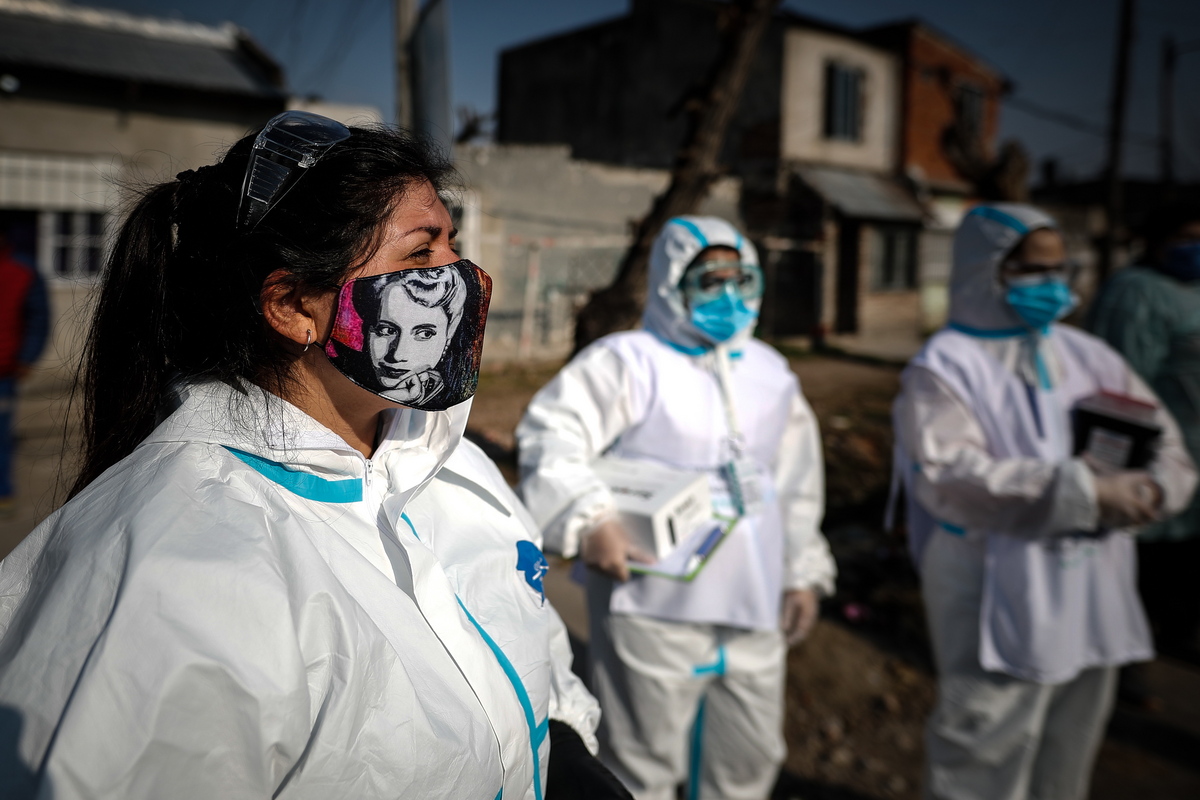 epa08582303 Health workers prepare to visit homes in the city Villa Fiorito, in the province of Buenos Aires, Argentina, 03 August 2020. Health authorities carried out an operation called 'Detectar' (detect), which seeks positive cases of covid-19 in the province of Buenos Aires, epicenter of the pandemic in Argentina. EPA/Juan Ignacio Roncoroni