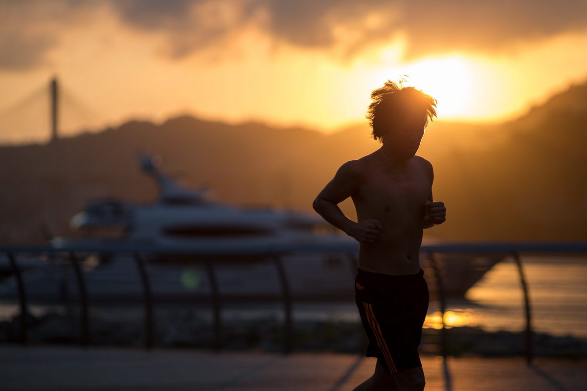 epa05340175 A man jogs at sunset on the waterfront in Tsing Yi, New Territories, Hong Kong, China, 01 June 2016. EPA/JEROME FAVRE