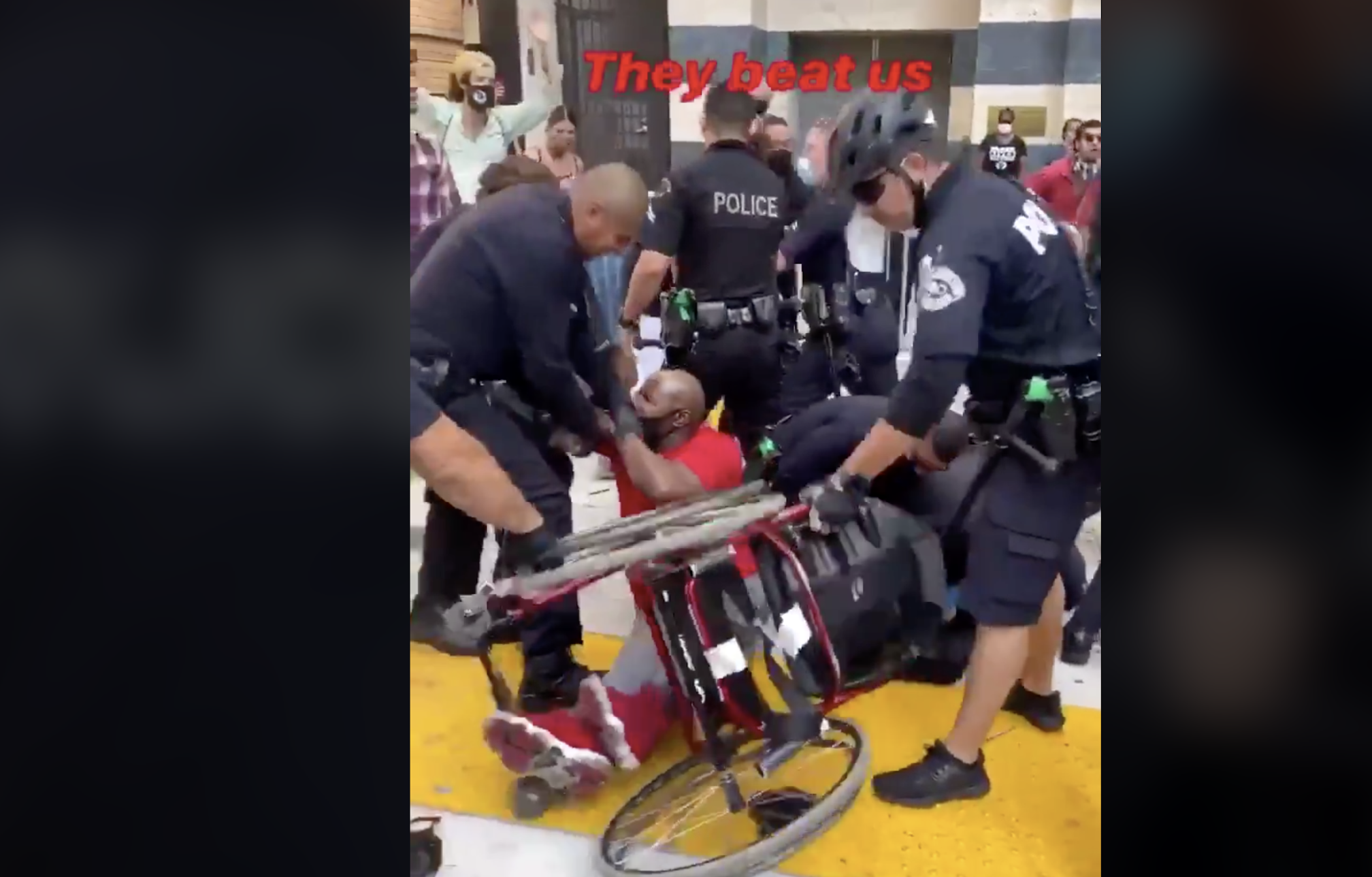 Νέο περιστατικό αστυνομικής βίας κατά ανθρώπου με κινητικά προβλήματα στο Λος Άντζελες. Τρεις τουλάχιστον αστυνομικοί χρειάστηκαν για να συλλάβουν έναν Αφροαμερικανό διαδηλωτή του “Black Lives Mattes”, ο οποίος μάλιστα βρισκόταν καθηλωμένος στο αναπηρικό αμαξίδιο μέχρι να τον πετάξουν με υπερβολική χρήση βίας από αυτό και να του το καταστρέψουν.