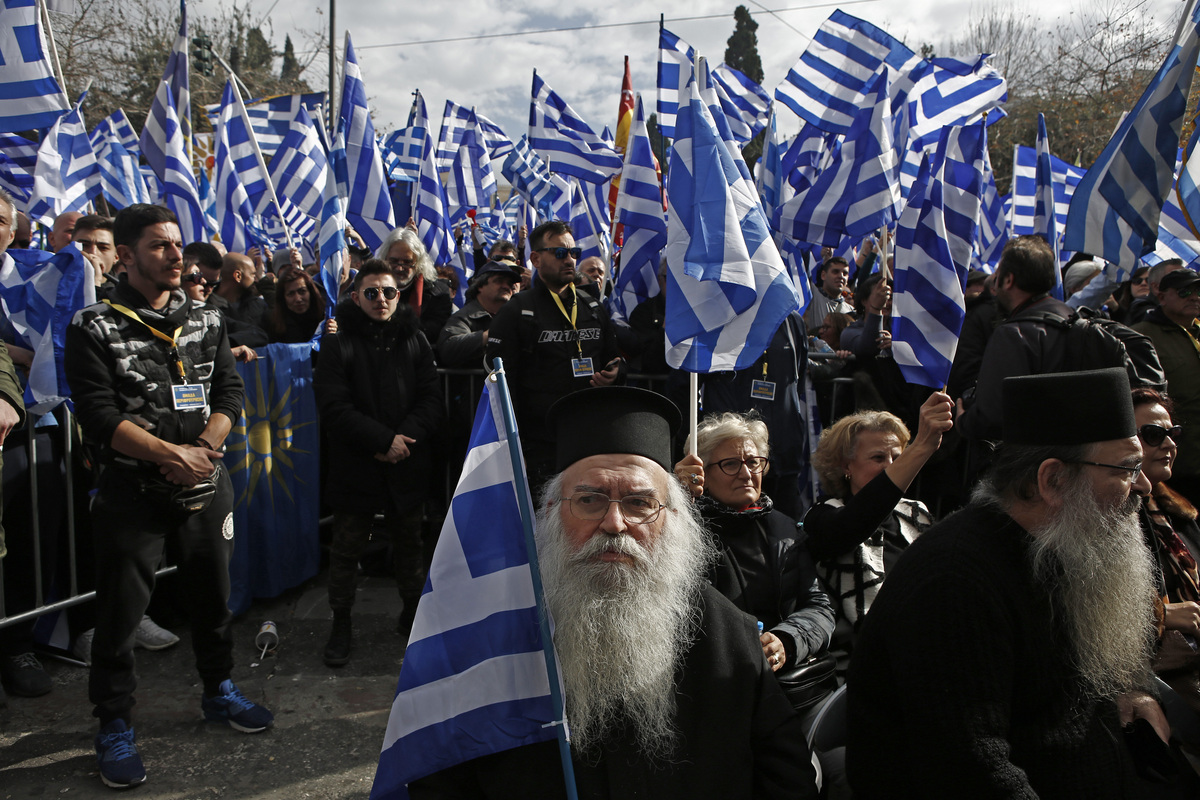 Μέλη μακεδονικών συλλόγων, κρατώντας ελληνικές σημαίες, συμμετέχουν σε συλλαλητήριο ενάντια στη Συμφωνία των Πρεσπών, στο Σύνταγμα ΑΠΕ-ΜΠΕ/ ΓΙΑΝΝΗΣ ΚΟΛΕΣΙΔΗΣ