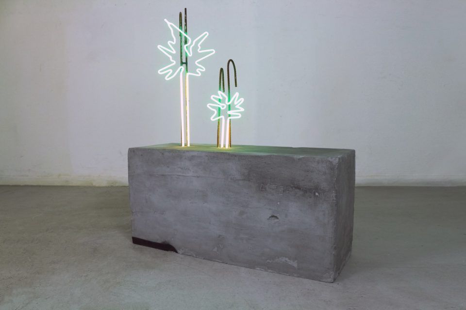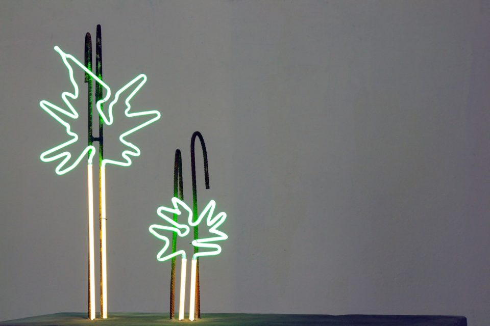 Στα τελάρα μου, αποχρωματίζω το τζιν και δημιουργώ φυτά που συνυπάρχουν με προσωπικά αντικείμενα που φωτογραφίζω, και άλλα υφάσματα. Παράλληλα, κατασκευές από μίγμα τσιμέντου συνομιλούν με φόρμες και φυτά από νέον. Μια αναφορά στις αναμονές των ημιτελών κτιρίων, σαν κενές υποσχέσεις που γεμίζουν με φώτα και ιστορίες της νυχτερινής ζωής. Στο σύνολο των έργων, η αστική χλωρίδα καταλαμβάνει κεντρικό ρόλο της αφήγησης. Αντιλαμβάνομαι τα φυτά και τις γλάστρες στην πλημμυρισμένη από τσιμέντο πόλη, είτε κοσμούν κοινόχρηστους χώρους είτε σε μπαλκόνια, ως δοχεία πληροφοριών. Θύλακες που συνεχώς αναπτύσσονται, καθώς επηρεάζουν, αλλάζουν και συμβάλλουν στο σύνολο ενός χώρου. Επηρεασμένος από τοπικούς και προσωπικούς μύθους, ανακάλυψα ότι μπορείς να βρεις ένα μεγάλο κομμάτι της αθηναϊκής ιστορίας στα φυτά της πόλης, που ριζώνουν και γίνονται μέρος της αστικής ζωής.
