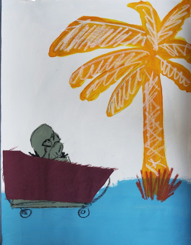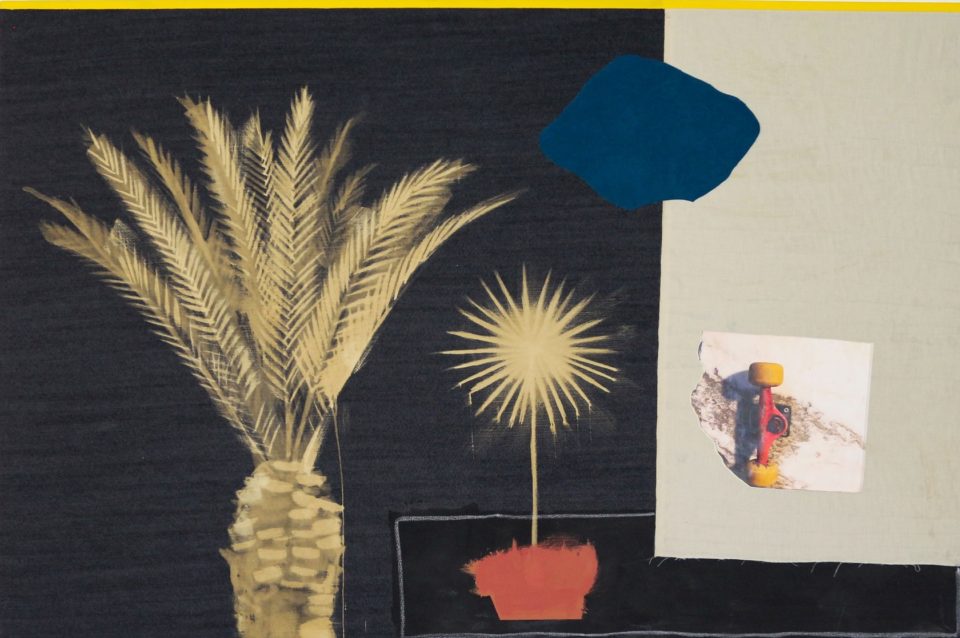 Anestis Ioannou, On a Hot Sidewalk of Summer, 2021, acrylics, oil pastel, pencil and textile on paper, 50×65 cm