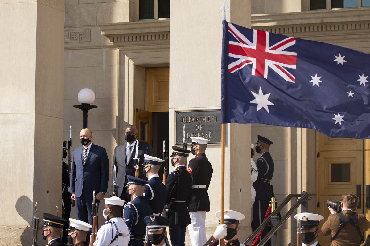 epa09469754 Minister of Defense of Australia Peter Dutton (L) and US Secretary of Defense Lloyd Austin (2-L) observe the national anthem of Australia during an honor cordon ceremony at the Pentagon in Arlington, Virginia, USA, 15 September 2021. Dutton and Austin are expected to discuss relations with China and security issues in the Asia-Pacific region. EPA/MICHAEL REYNOLDS