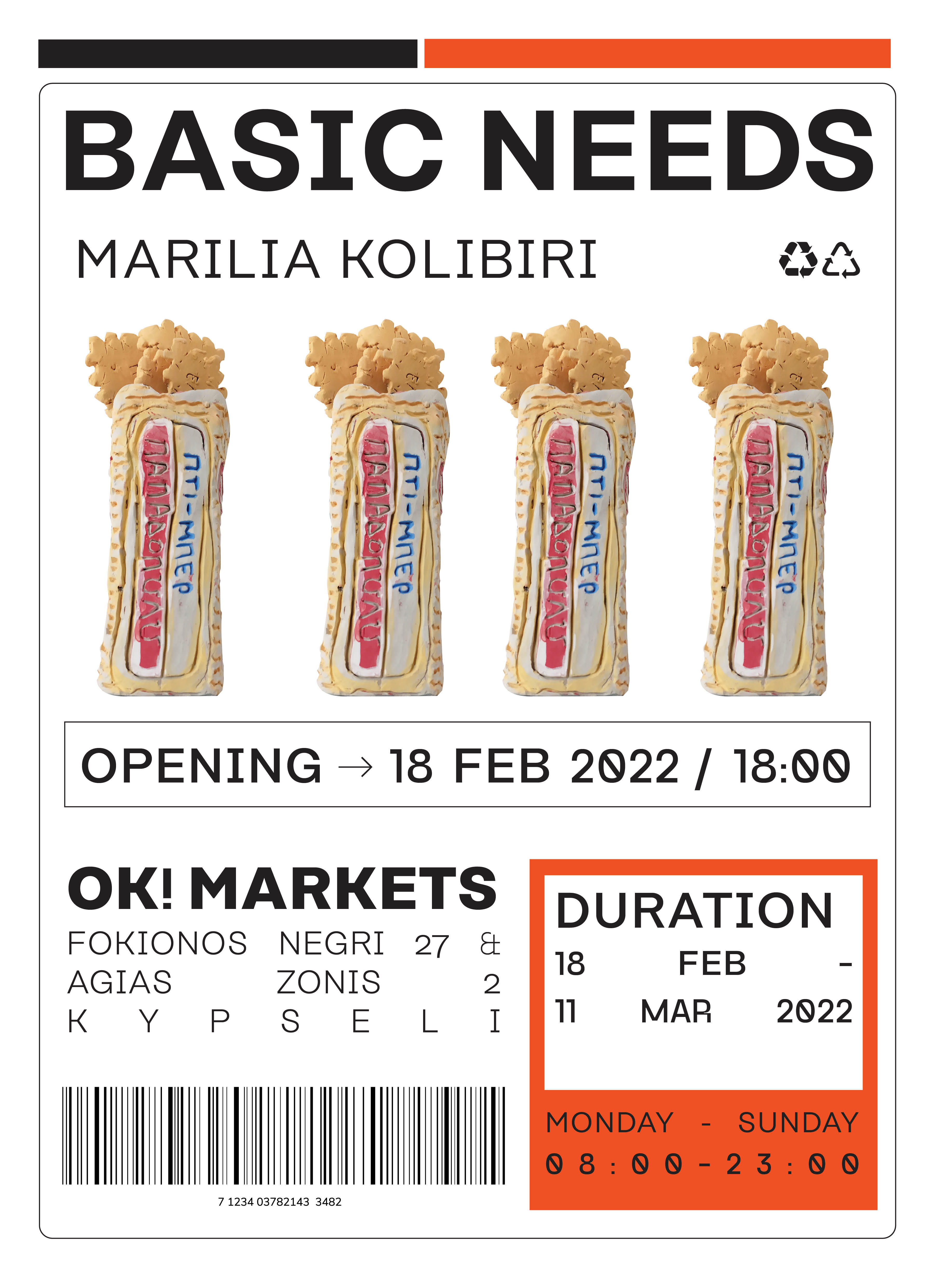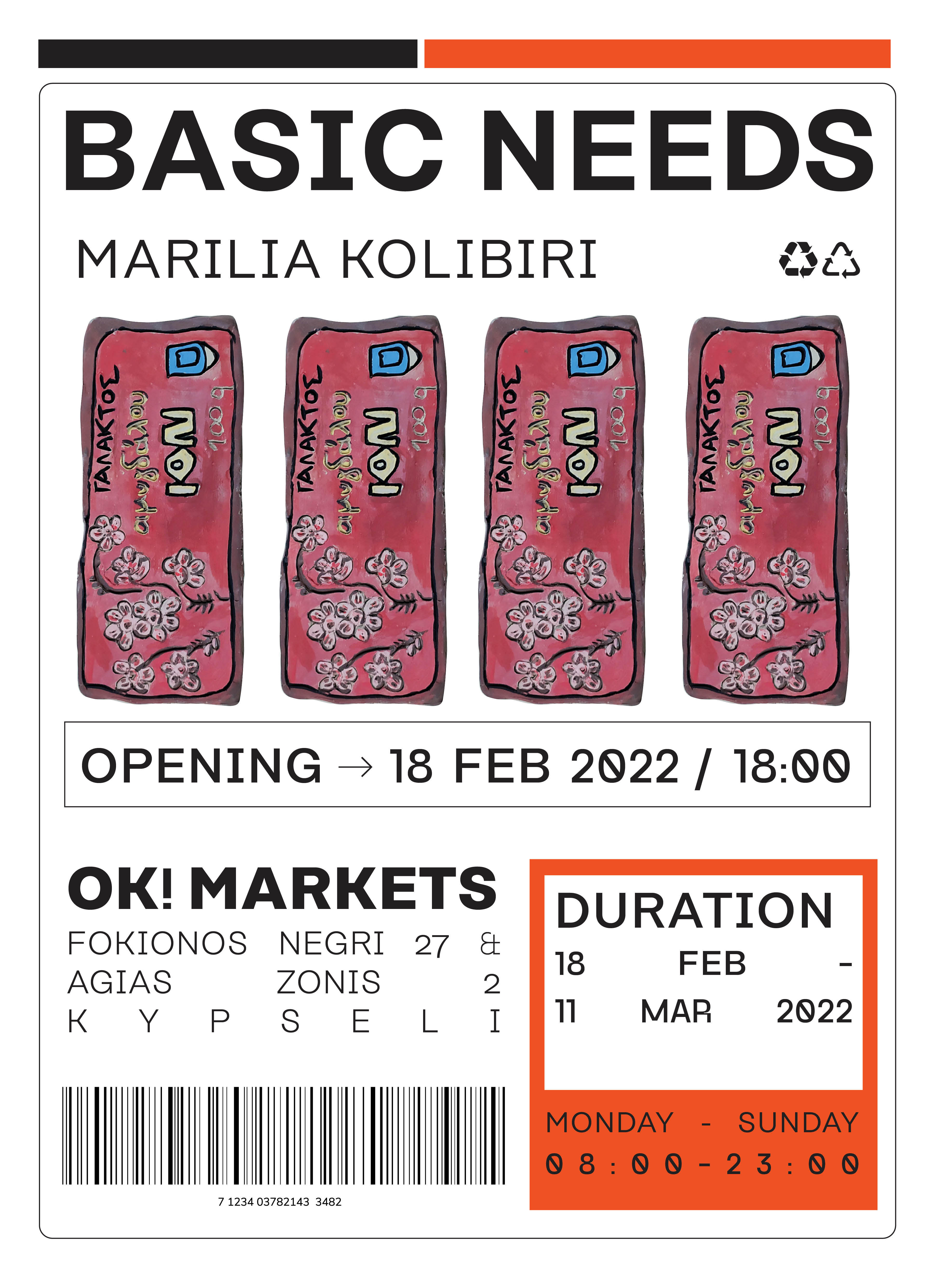 Το νέο πρότζεκτ, με τίτλο Basic Needs, της εικαστικού Μαριλίας Κολυμπίρη διερευνά τη σχέση του ανθρώπου με τον χώρο του, με τα αντικείμενα που τον περιβάλλουν, τις βιοτικές του ανάγκες. Το ‘Basic Needs’ θα παρουσιαστεί τον Φλεβάρη του 2022 σε έναν από τους πλέον απροσδόκητους χώρους, στο OK! Markets στη Φωκίωνος Νέγρη. Δίπλα στο συνηθισμένο προϊοντικό μείγμα που βρίσκει κανείς σε ένα μίνι σούπερ μάρκετ, από γαλακτοκομικά, τρόφιμα ξηρού φορτίου, καθαριστικά προϊόντα και άλλα είδη πρώτης ανάγκης, η Κολυμπίρη παρουσιάζει μια σειρά από νέα κεραμικά έργα με άμεση αναφορά στα αντικείμενα αυτά.