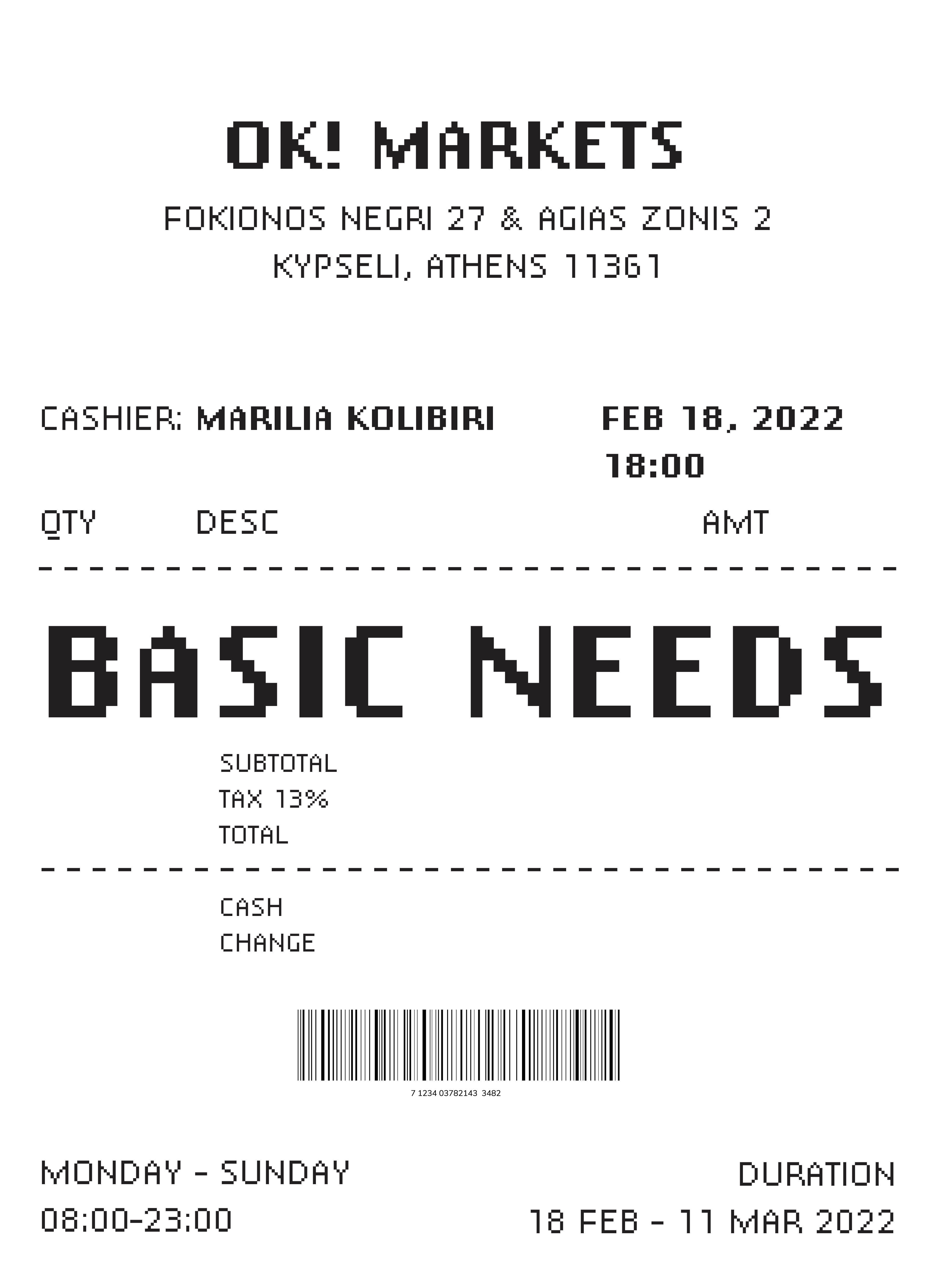Ο ελεύθερος χρόνος κατανεμήθηκε σε δύο χώρους, στο σπίτι και σε χώρους αγοράς ειδών βασικής ανάγκης. Οι χώροι αυτοί απέκτησαν μια νέα και ενδιαφέρουσα διάσταση, καθώς μετατράπηκαν σε ένα δυναμικό σύμπαν μέσα στο οποίο μπορούσαν να ικανοποιηθούν όχι μόνο οι καταναλωτικές ανάγκες αλλά και η ανάγκη για επικοινωνία και συναναστροφή. Το πρότζεκτ ‘Basic Needs’ στο OK! Markets θα δώσει την ευκαιρία να αναπτυχθούν ανάμεσα στους καταναλωτές, στην εικαστικό και στους υπεύθυνους του καταστήματος νέες σχέσεις αλληλεπίδρασης μέσα από την απρόβλεπτη χρήση του σούπερ μάρκετ ως χώρο τέχνης ενώ παράλληλα θα πραγματοποιηθούν δράσεις στη γειτονιά της Φωκίωνος Νέγρη με τη συμμετοχή των κατοίκων της περιοχής, της ομάδας Documatism και του έργου “the AfroGreeks”, καλλιτεχνών και δημοσιογράφων, με στόχο την αποκατάσταση της εγγύτητας σε μια εποχή που οι αποστάσεις επιβάλλονται.