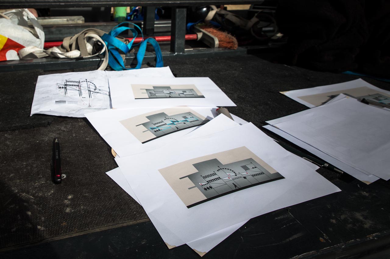 Τα “ξυστά” την ημέρα, αλληλεπιδρούν με το φως του ήλιου και δημιουργούν σκιές στην τυφλή όψη που βρίσκεται στο πίσω μέρος της εγκατάστασης.  Τη νύχτα, τα ίδια “ξυστά” φωτίζονται και λειτουργούν ως σκοτεινές σιλουέτες, σε αντίθεση με τα φωτεινά περιγράμματα κατά το μήκος της κατασκευής. Στο σύνολο της η φωτιστική εγκατάσταση δημιουργεί νέες γεωμετρίες και φωτιστικά παιχνίδια.
