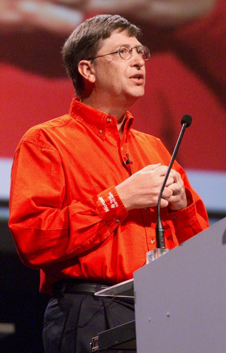 DCA99 - 20000425 - NEW ORLEANS, UNITED STATES : Bill Gates, Chairman and Chief Software Architect of Microsoft, gives his keynote address at the Windows Hardware Engineering Conference (WinHEC) 2000 in New Orleans, 25 April 2000. Gates told the developers at the conference that "Not only are PCs selling in record numbers today, but we are on the verge of some exciting innovations that will make the PC an even more vital hub to the future of computing". EPA PHOTO AFP/JEFF CHRISTENSEN/jc/gd