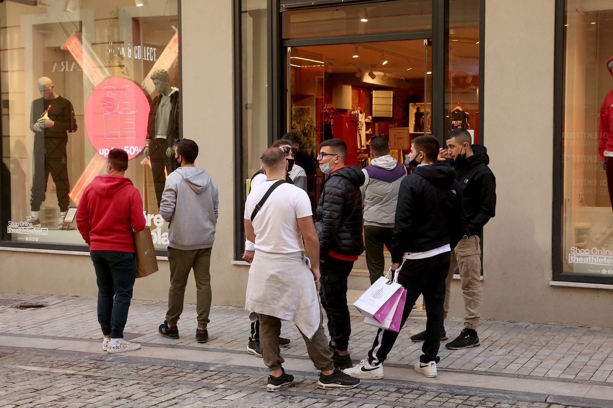 Κόσμος ψωνίζει σε καταστήματα της οδού Ερμού με ισχυρή επιτήρηση της αστυνομίας μετά την ανακοίνωση των νέων μέτρων από την Πολιτική Προστασία για τον έλεγχο της πανδημίας, Σάββατο 30 Ιανουαρίου 2021. ΑΠΕ-ΜΠΕ /ΑΠΕ-ΜΠΕ/ ΟΡΕΣΤΗΣ ΠΑΝΑΓΙΩΤΟΥ