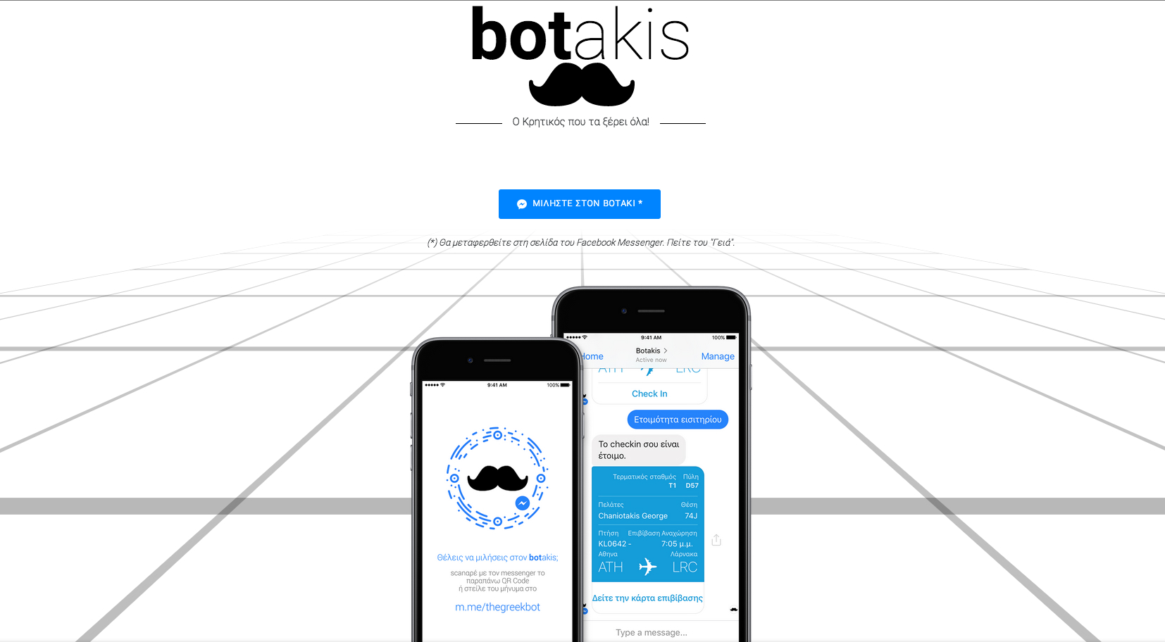 Ο botakis είναι ένα chatbot, δηλαδή ένα πρόγραμμα που προσομοιάζει φυσική συζήτηση με άνθρωπο μέσω του διαδικτύου και συγκεκριμένα – προς το παρόν – μέσω του Facebook Messenger. Τα chatbots έχουν σκοπό την εξυπηρέτηση των χρηστών και ενδεικτικά μπορούν να να κάνουν κράτηση σε ένα ξενοδοχείο, να παραγγείλουν ένα γεύμα, να σας αγοράσουν ακτοπλοϊκό ή αεροπορικό εισιτήριο, να κάνουν check in για την πτήση, να σας πουν τον καιρό, να σας βρουν τραπέζι σε εστιατόριο, να σας πουν τα νέα και άλλα πολλά χρήσιμα. Φανταστείτε να μπορείτε να κάνετε κράτηση πτήσης με ένα απλό μήνυμα σε μια αεροπορική εταιρεία και να πληρώνετε με μια απλή διαδικασία. Φαίνεται οτι μπορούν να αντικαταστήσουν την τηλεφωνική κλήση, το fax, το email και την επίσκεψη σε ένα δικτυακό τόπο. Φοβερό;