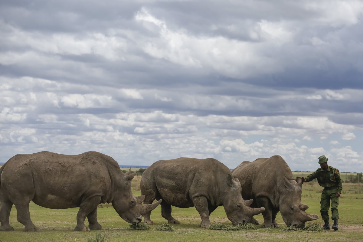 epa05942593 (From L-R) Eighteen-year-old female southern white rhino Dauwa and the last surviving two female northern white rhinos Najin (27) and Fatu (17) are fed by a caretaker at Ol Pejeta Conservancy near Nanyuki, some 200 kilometers north of Nairobi, Kenya, 03 May 2017. Ol Pejeta Conservancy, where Sudan and the world's last two female northern white rhinos live, has partnered with the popular dating app Tinder in an aim to raise 9 million US dollars to develop reproductive technologies such as in-vitro fertilization (IVF). Experts say that even if the IVF techniques will be developed for the successful artificial reproduction in the future, the northern whites will most likely be extinct in a few years, for now. Ol Pejeta is a home to the last three surviving rhino subspecies on the planet. EPA/DAI KUROKAWA