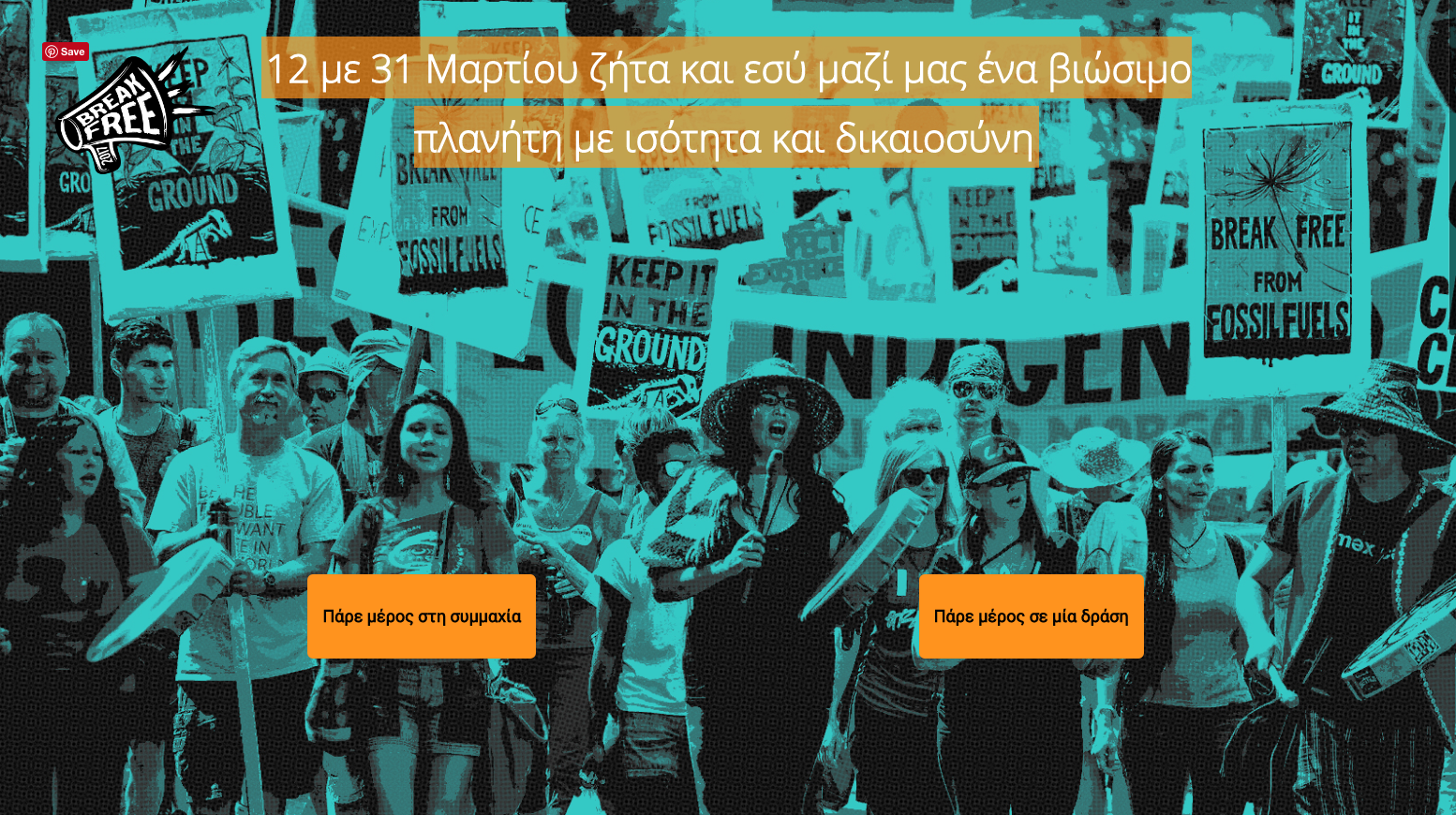 Το Break Free ξεκίνησε πέρυσι ως μία παγκόσμια ομπρέλα δράσεων σε 20 χώρες ενάντια στα ορυκτά καύσιμα. Φέτος, από τις 12 έως τις 31 Μαρτίου θα υλοποιηθούν εκατοντάδες δράσεις σε 35 χώρες. Στην Ελλάδα -όπως και σε άλλες χώρες- το θέμα των δράσεων είναι πολυδιάστατο και αφορά μία ευρύτερη κοινωνική συμμαχία, που θα φέρνει κοντά εκατομμύρια πολίτες με διαφορετική αφετηρία, αλλά το ίδιο κίνητρο: τη συλλογική διεκδίκηση για ένα βιώσιμο πλανήτη, με ισότητα και δικαιοσύνη. Σε όλο το διάστημα (12 – 31 Μαρτίου) κάθε οργάνωση ή πολίτης θα μπορεί να ενσωματώνει δράσεις και να μεγαλώσει τη συμμαχία μέσα από τη νέα ηλεκτρονική πλατφόρμα προώθησης του κινήματος