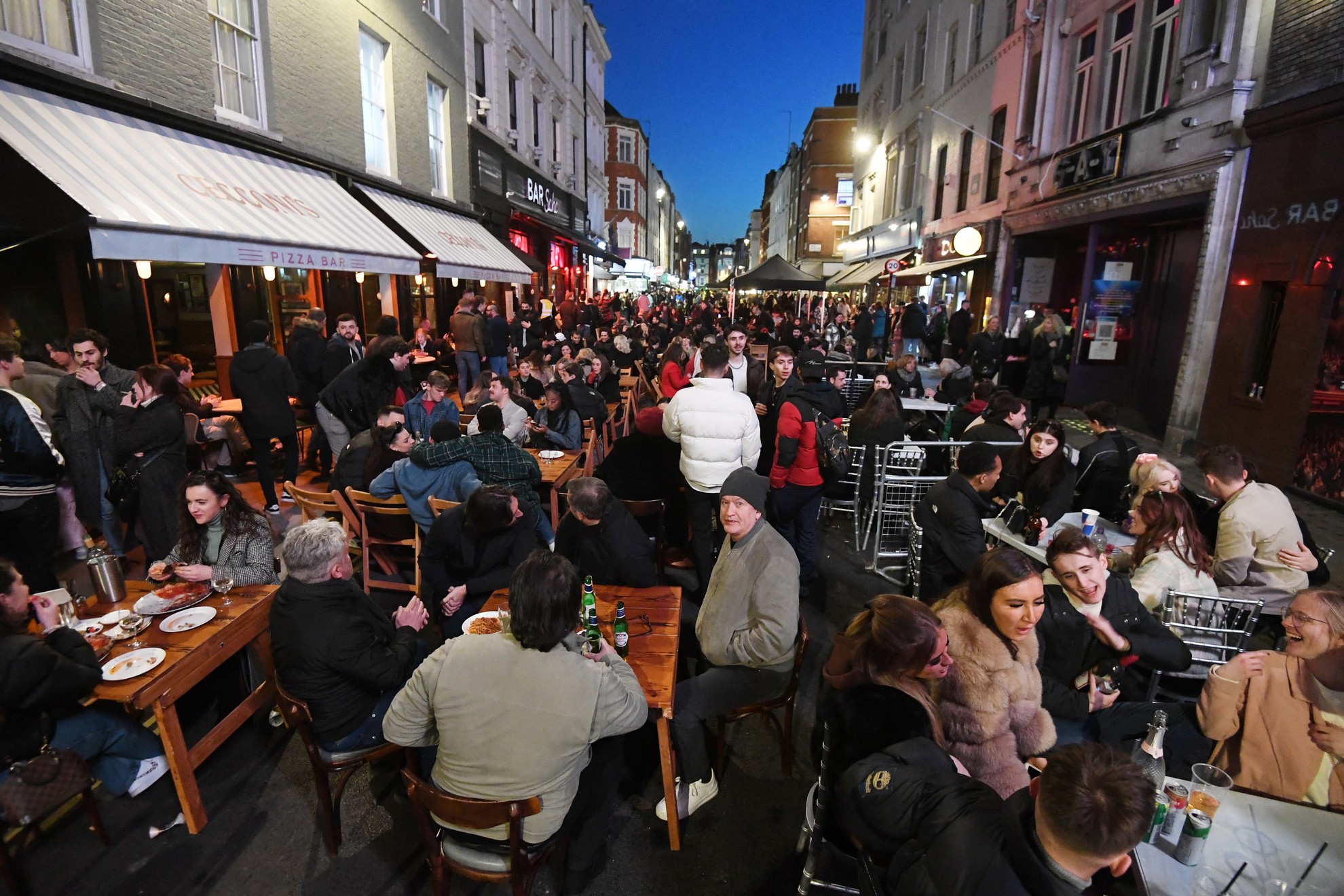 epa09131723 People drink and eat outside in Soho in London, Britain, 12 April 2021. Britain has begun its second phase of unlocking after months of lockdown. Pubs, restaurants and shops are reopening from April 12. EPA/FACUNDO ARRIZABALAGA