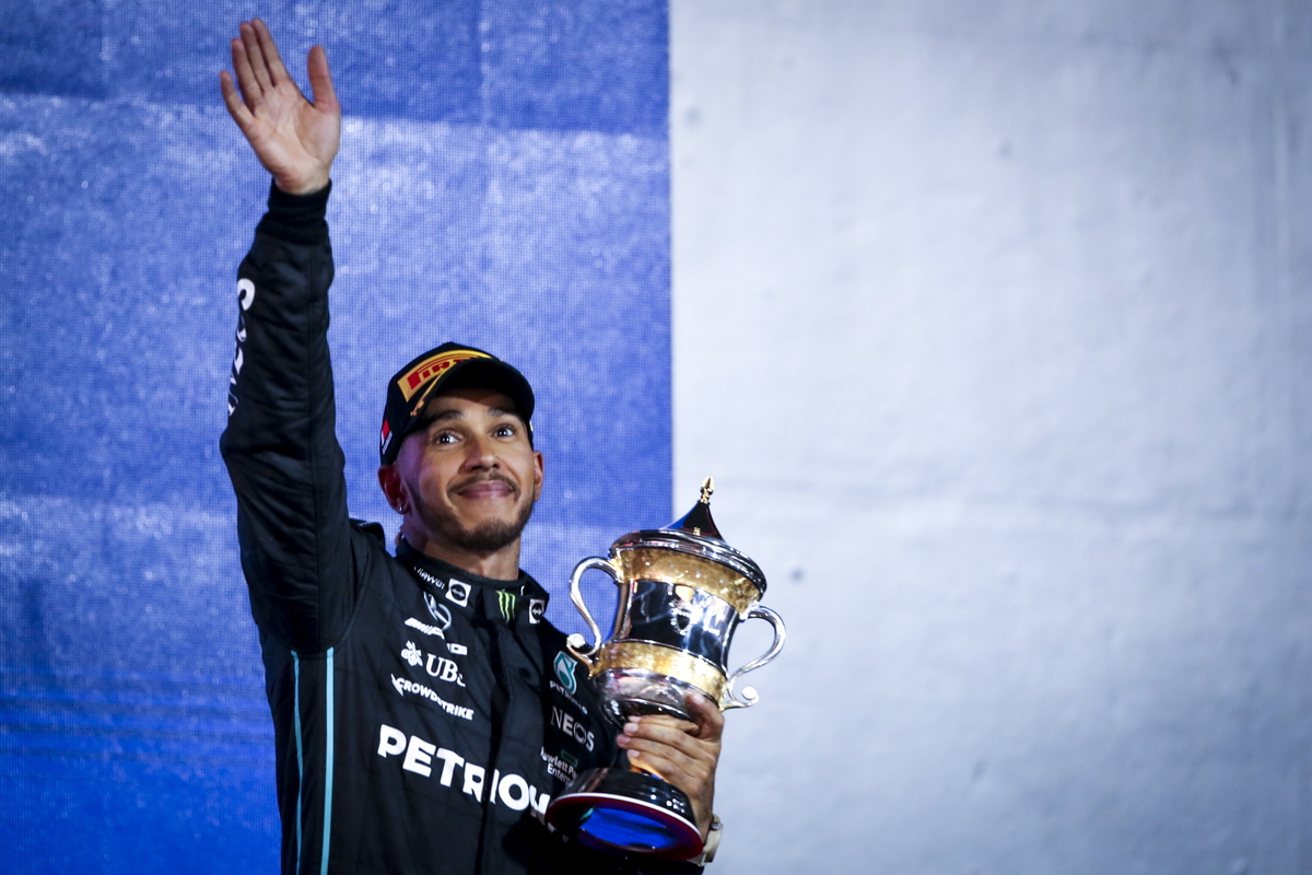 epa09838937 British Formula One driver Lewis Hamilton of Mercedes-AMG Petronas holds his third place trophy after the Formula One Grand Prix of Bahrain at the Bahrain International Circuit in Sakhir, Bahrain, 20 March 2022. EPA/ALI HAIDER