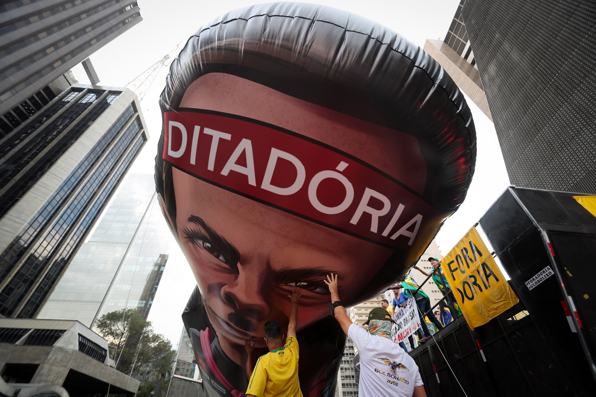 Βραζιλιάνοι μεταφέρουν μεγάλο μπαλόνι με την εικόνα του του κυβερνήτη του Σάο Πάολο, Joao Doria, με την ένδειξη Dita (torship) Doria, καθώς διαδηλώνουν, κατά τη διάρκεια της Εργατικής Πρωτομαγιάς, ενάντια στα μέτρα κοινωνικής απομόνωσης που αποφάσισε ο κυβερνήτης και υπέρ της στρατιωτικής επέμβασης. Σάο Πάολο, Βραζιλία, 1 Μαΐου 2020. Ο πρόεδρος της Βραζιλίας Jair Bolsonaro είπε ότι θα ήθελε όλοι οι Βραζιλιάνοι να επιστρέψουν στη δουλειά, σε μήνυμά του προς τους κυβερνήτες και τους δημάρχους της χώρας, για τα μέτρα κοινωνικής απομόνωσης που αποφασίστηκαν για τον περιορισμό του κοροναϊού. Ο Μπολσονάρο, υποτιμά την σοβαρότητα του ιού και υπερασπίζεται το τέλος των καραντίνων. EPA / Fernando Bizerra Jr.