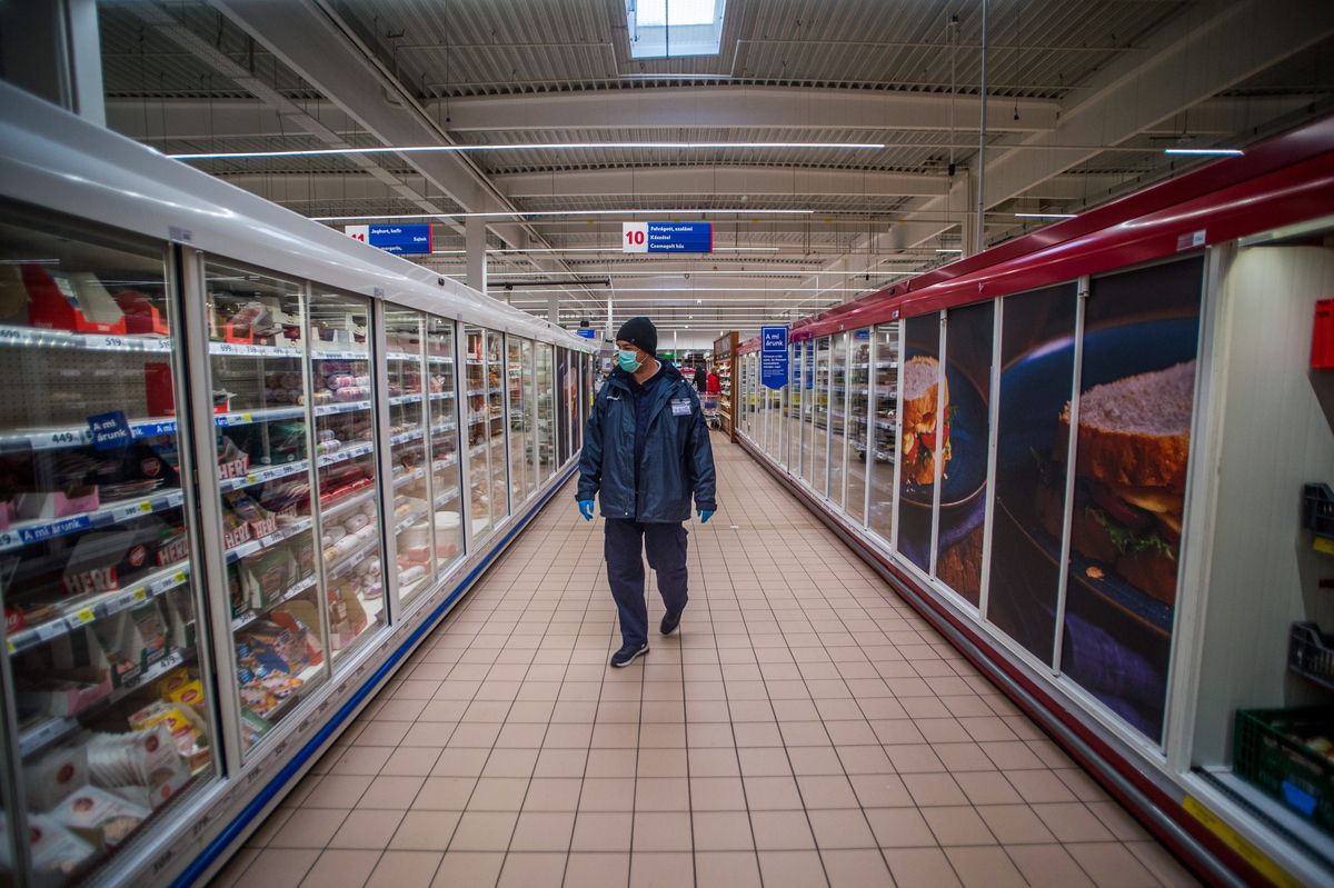 epa08317595 Civil guards wearing protective masks and rubber gloves buy goods in a supermarket for elderly persons, who are unable to leave home due to the coronavirus pandemic in the 13th district of Budapest, Hungary, 23 March 2020 (issued 24 March 2020). In Hungary the number of people confirmed to be infected with coronavirus increased to 187, and eight people have died of the COVID-19 disease. EPA/Zoltan Balogh HUNGARY OUT
