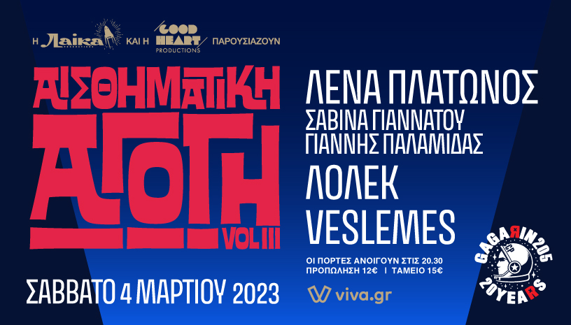 H Laika Productions σε συνεργασία με την Goodheart Productions παρουσιάζουν την Αισθηματική Αγωγή Vol 3, το Σάββατο 4 Μαρτίου 2023, στο Gagarin 205 με καλεσμένους επί σκηνής την Λένα Πλάτωνος, την Σαβίνα Γιαννάτου, τον Γιάννη Παλαμίδα, τον Λόλεκ και τον Veslemes.