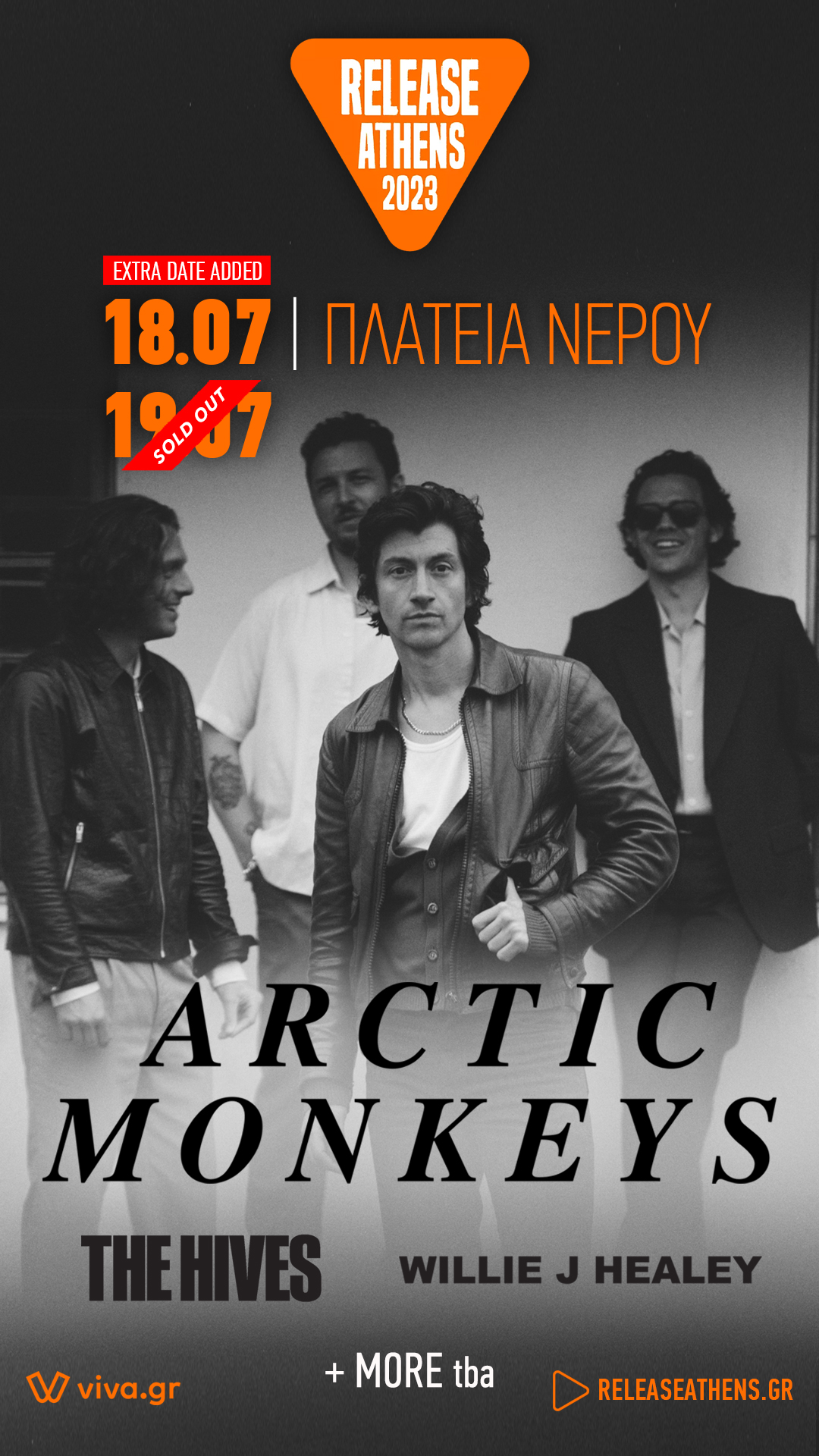 Μετά την εκπληκτική ανταπόκριση του κοινού και το ιστορικό, πλέον, sold out για την εμφάνιση των Arctic Monkeys στις 19 Ιουλίου, το Release Athens βρίσκεται στην ευχάριστη θέση να ανακοινώσει πως προστίθεται και δεύτερη ημέρα στο φεστιβάλ, με το ίδιο lineup (Arctic Monkeys + The Hives, Willie J Healey), την Τρίτη 18 Ιουλίου, στην Πλατεία Νερού, με σκοπό να ικανοποιηθεί η ζήτηση, η οποία παραμένει πρωτοφανής.