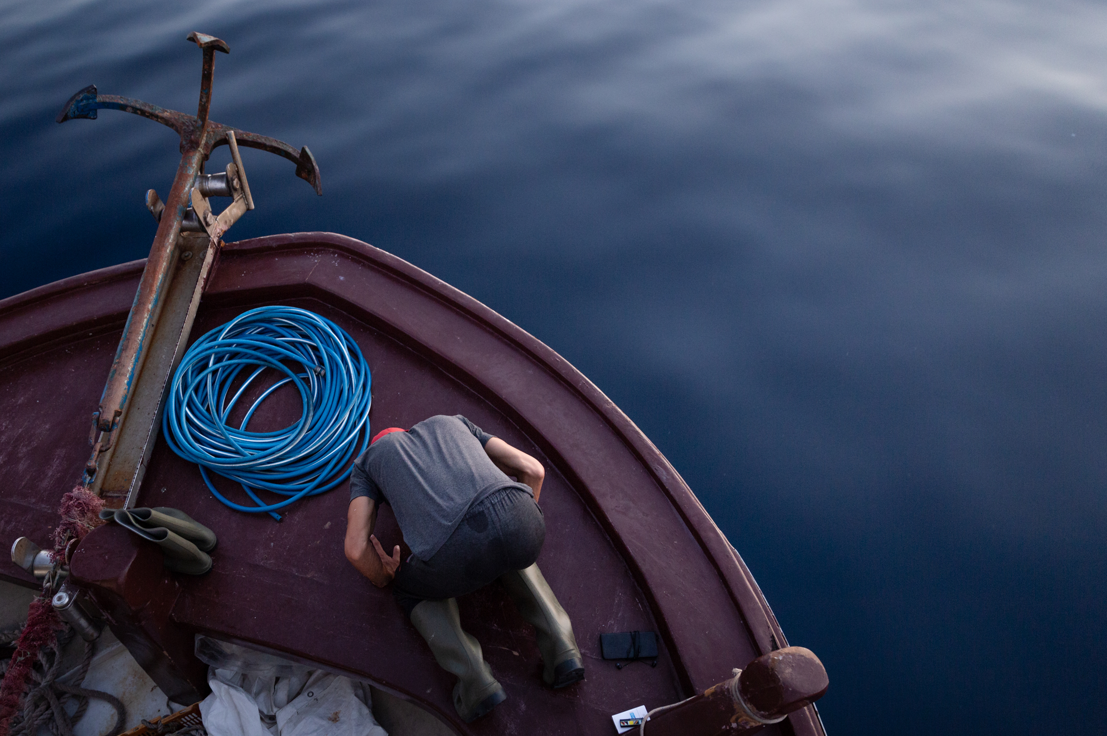 An Egyptian fisherman pray on the bow of the vessel, in the gulf of Kavala, Thracian Sea, north Greece.