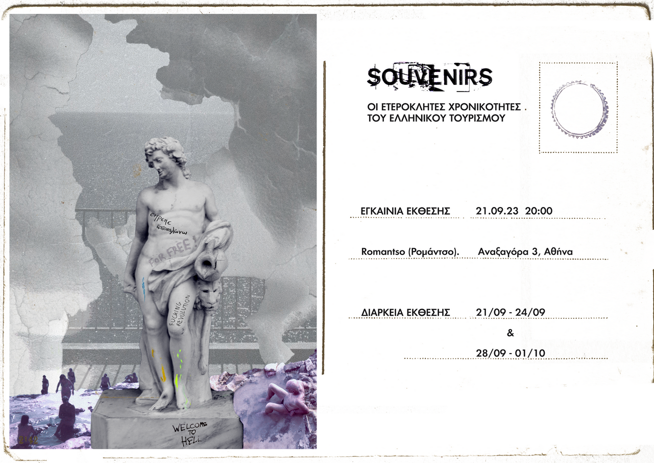 Η φωτογραφική ομάδα Άλως και οι Reporters United παρουσιάζουν την έκθεση φωτογραφίας «souvenirs : οι ετερόκλητες χρονικοτητες του ελληνικού τουρισμού». Πρόκειται για μια συλλογική δουλειά, απόσταγμα των επισκέψεων της ομάδας στις λουτροπόλεις που συνιστούσαν τουριστικούς προορισμούς παλιότερων εποχών. Η αφαιρετική και άχρονη αναπαράσταση αυτών των περιοχών μας έδωσε την δυνατότητα να διερωτηθούμε για τη σύγχρονη κατάσταση και τα χαρακτηριστικά του τουρισμού. Έτσι η διαδικασία της επιμέλειας έγινε μια σύνθετη πράξη, εμπλέκοντας φωτογράφους και θεωρητικούς της φωτογραφίας, καθώς και επιστήμονες στο πεδίο του τουρισμού που έκαναν την δική τους ανάγνωση στο υλικό της ομάδας.