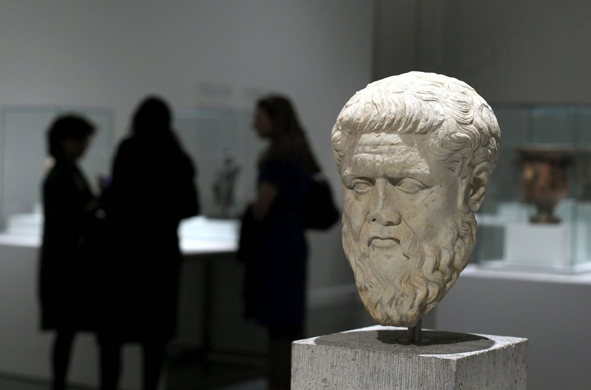 epa04102584 The bust 'Plato's Head' (110-80 BC) is on display in the exhibition 'Mediterreneo. Del mito a la razon' lit.: Mediterrenean (Sea). From myth to reason) on the origins of Greece's democracy at CaixaForum cultural center in Barcelona, Spain, 27 February 2014. The exhibition, displaying 165 Greek-Latin exhibits, runs from 27 February to 15 June. EPA/TONI ALBIR