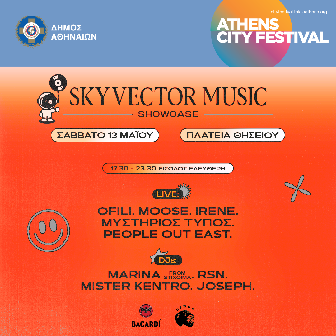 Τo Σάββατο 13 Μαΐου η δισκογραφική εταιρεία Sky Vector Music συμμετέχει για πρώτη φορά στο Athens City Festival, με ένα event που θα συμβεί στην καρδιά της πόλης και θα συνδυάζει ζωντανές εμφανίσεις και DJ sets. Hip hop, trap, afrobeats, R&B από τους Moose, Irene, Ofili, People Out East, Μυστήριος Τύπος, Mr. Kentro, RSN, Johnny B και άλλους. Ένα block party με urban χαρακτήρα σε ένα από τα ομορφότερα σημεία της Αθήνας!