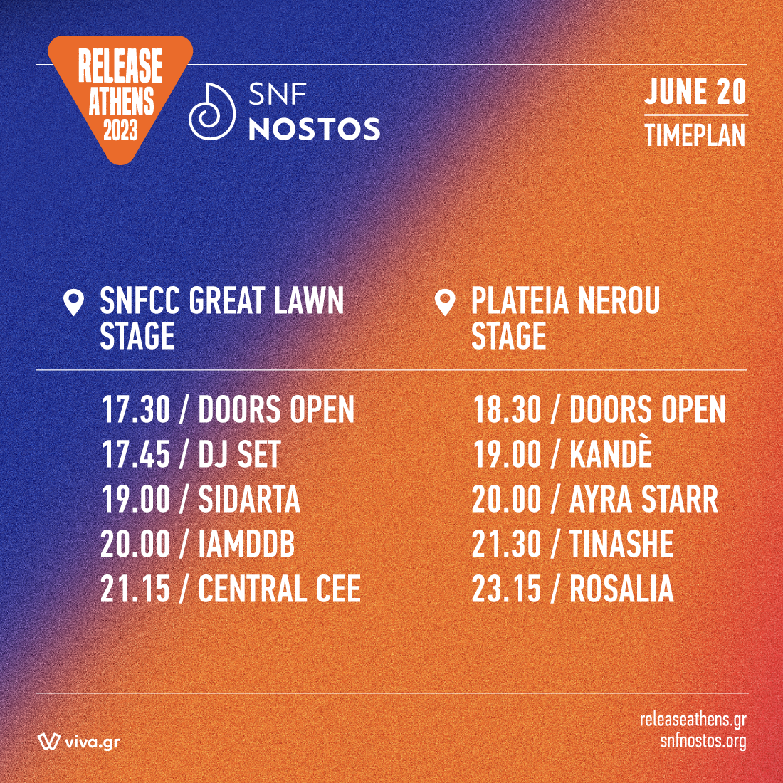 Το 2023, το Release Athens και το SNF Nostos του Ιδρύματος Σταύρος Νιάρχος (ΙΣΝ) ενώνουν τις δυνάμεις τους, παρουσιάζοντας τρεις μοναδικές φεστιβαλικές ημέρες σε δύο σκηνές. Το Release Athens Χ SNF Nostos πραγματοποιείται στις 20, 21 και 23 Ιουνίου και φέρνει μεγάλα ονόματα της παγκόσμιας και ελληνικής σκηνής σε δύο stages, στην Πλατεία Νερού και το Ξέφωτο του ΚΠΙΣΝ, δίνοντάς μας την ευκαιρία να ζήσουμε ένα συναρπαστικό συναυλιακό τριήμερο που αποτελεί αναπόσπαστο κομμάτι του Release Athens 2023.