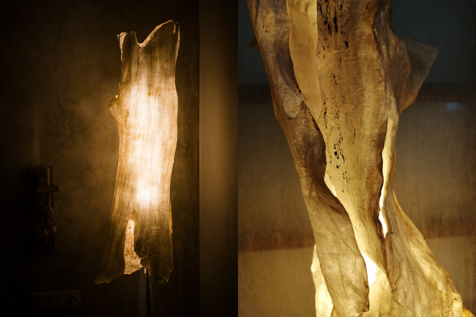 Τα υλικά των έργων προέρχονται από τη φύση για να ξαναγίνουν “φύση” τα ίδια. Ανακυκλωμένα χαρτιά, μήτρες από κομμάτια ξύλου, δημιουργούν ένα αυτόνομο εικαστικό σύμπαν που χαρακτηρίζεται από πλαστικότητα και διαύγεια. Έργα που αφήνονται στο φως. Επιτρέπουν στο φως να τα διαπεράσει, το ανακλούν, τελικά γίνονται τα ίδια πομποί φωτός. Και, καθώς το φως τους σμίγει με το φυσικό φως που τα περιβάλλει, γίνονται ένα με το περιβάλλον τους, αφομοιώνονται από αυτό, πάντοτε όμως διατηρώντας την εικαστική αυτονομία τους.