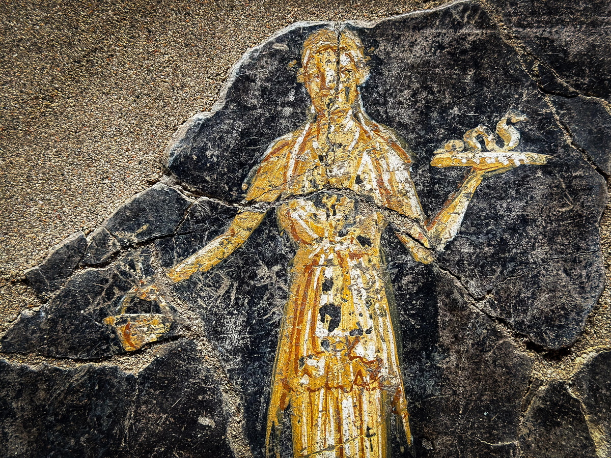 epa11030954 A mural painting is on display at the exhibition 'The other Pompeii. Common lives in the shadow of Vesuvius' at the Palestra Grande in Pompeii, Italy, 15 December 2023. The exhibition scheduled from 15 December shows the daily life of the common population, made up of slaves, freedmen, artisans and workers of various categories, that Pompeii often silent in ancient sources. EPA/CESARE ABBATE