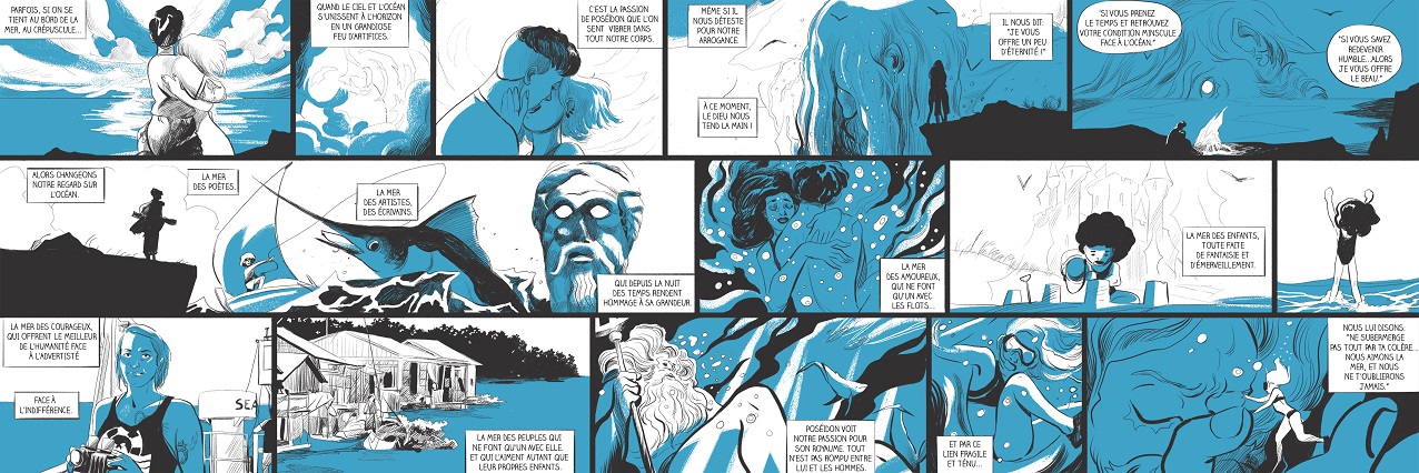Έξι διεθνείς καλλιτέχνες παρουσιάζουν αδημοσίευτα έργα τους εμπνευσμένα από τη θάλασσα που, σαν χειροπιαστή αλλά και αλληγορική έννοια, τους δίνει την ευκαιρία να αφηγηθούν τον κόσμο και το τοπίο, ένα αρχέγονο και ζωτικής σημασίας στοιχείο που ενώνει πολιτισμούς, που γίνεται χώρος συνάντησης, διέλευσης, ένταξης και ανακάλυψης. Την έκθεση επιμελήθηκαν η Elisabetta Tramacere (αρχισυντάκτρια των εκδόσεων Diabolo edizioni) και η Donata Bologna, σε συνεργασία για την Ελλάδα με το διεθνές φεστιβάλ Comicdom Con Athens, και σε συντονισμό Αφροδίτης Οικονομίδου και Alice Bottega.