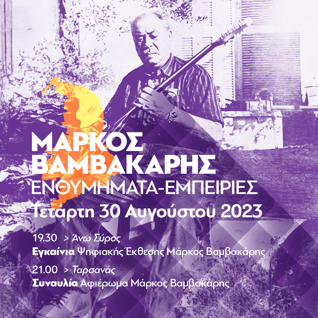 Λίγοι τόποι είναι τόσο άρρηκτα συνδεδεμένοι με τους καλλιτέχνες τους στη συνείδηση του κοινού, όσο η Σύρος με τον Μάρκο Βαμβακάρη. Ο σπουδαίος καλλιτέχνης, ο θεμελιωτής του ρεμπέτικου, γεννήθηκε, εμπνεύστηκε, αγάπησε και αγαπήθηκε βαθιά στη Σύρο, εκεί όπου ο Δήμος Σύρου-Ερμούπολης εγκαινιάζει τη μόνιμη έκθεση «Μάρκος Βαμβακάρης: Ενθυμήματα-Εμπειρίες», αφιερωμένη στη ζωή και το έργο του. Μια σημαντική έκθεση, φόρος τιμής στη συναρπαστική ζωή και την ανεκτίμητη παρακαταθήκη του μεγάλου Συριανού ρεμπέτη, που θα αποτελέσει σταθερό σημείο αναφοράς για κάθε επισκέπτη του νησιού.