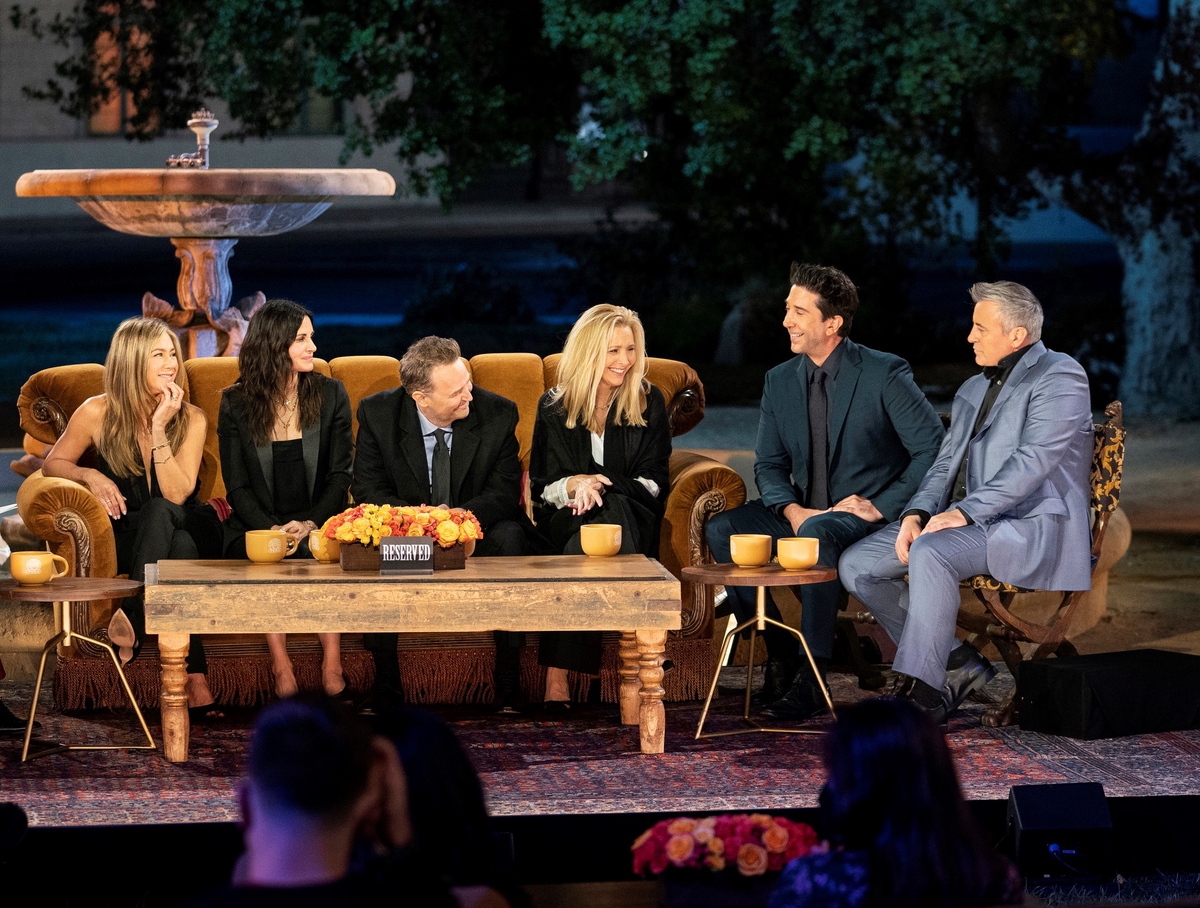 epa09231502 An undated handout photo made available by HBO Max shows the cast of the US series 'Friends' (L-R) Jennifer Aniston, Courteney Cox, Matthew Perry, Lisa Kudrow, David Schwimmer and Matt Leblanc during the special 'Friends: The Reunion' Los Angeles. The retrospective meeting combines interviews and intimate moments between the actors of this comedy. Seventeen years after their goodbye, the six stars of 'Friends' reunited in the special program that premieres on HBO Max on 27 May 2021. EPA/Terence Patrick HANDOUT ONLY AVAILABLE TO ILLUSTRATE THE ACCOMPANYING NEWS / MANDATORY CREDIT HANDOUT EDITORIAL USE ONLY/NO SALES
