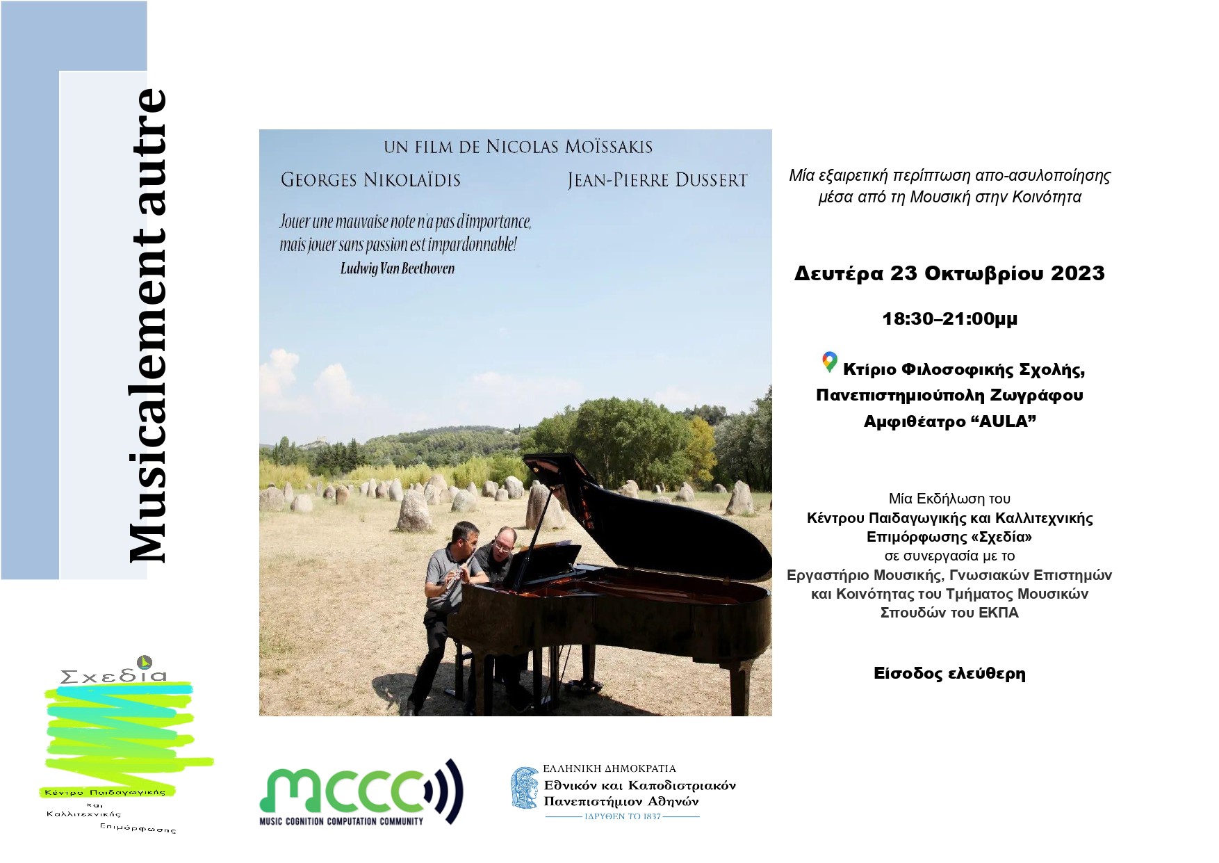 Στόχος της εκδήλωσης είναι να αναδειχθεί η δύναμη του ακτιβισμού μέσω της τέχνης, με την προβολή της Γαλλικής ταινίας – ντοκιμαντέρ Musicalement autre του Nicolas Moissaki, που αφηγείται τη συγκλονιστική ιστορία δυο μουσικών: του Jean Pierre Dussert, ενός αυτιστικού και σχιζοφρενή βιρτουόζου πιανίστα, μιας μουσικής ιδιοφυίας, που πέρασε μια περίοδο 27 χρόνων εγκλεισμού σε ψυχιατρεία και του Γιώργου Νικολαίδη, Διευθυντή Μουσικής Ακαδημίας στο Παρίσι, εξαιρετικού φλαουτίστα και ακτιβιστή, που ανέλαβε το επίπονο έργο να στηρίξει τον Jean Pierre να βγει από το άσυλο και να ξαναρχίσει μια κανονική και δημιουργική ζωή. Η ταινία καταγράφει αυτή την αμφίδρομα ζωογόνα σχέση μεταξύ των δύο μουσικών. Η πρώτη εκτός Γαλλίας προβολή της ταινίας πραγματοποιήθηκε στο Φεστιβάλ Μεσογειακού Ντοκυμαντέρ «Μεσογειακοί Διάλογοι» στο Καρλόβασι της Σάμου στις 18 Σεπτεμβρίου 23 και απέσπασε ενθουσιώδη υποδοχή από το κοινό και πολύ θετικές κριτικές για τις ανθρωπιστικές αξίες που προωθεί και την αισιόδοξη ματιά της.
