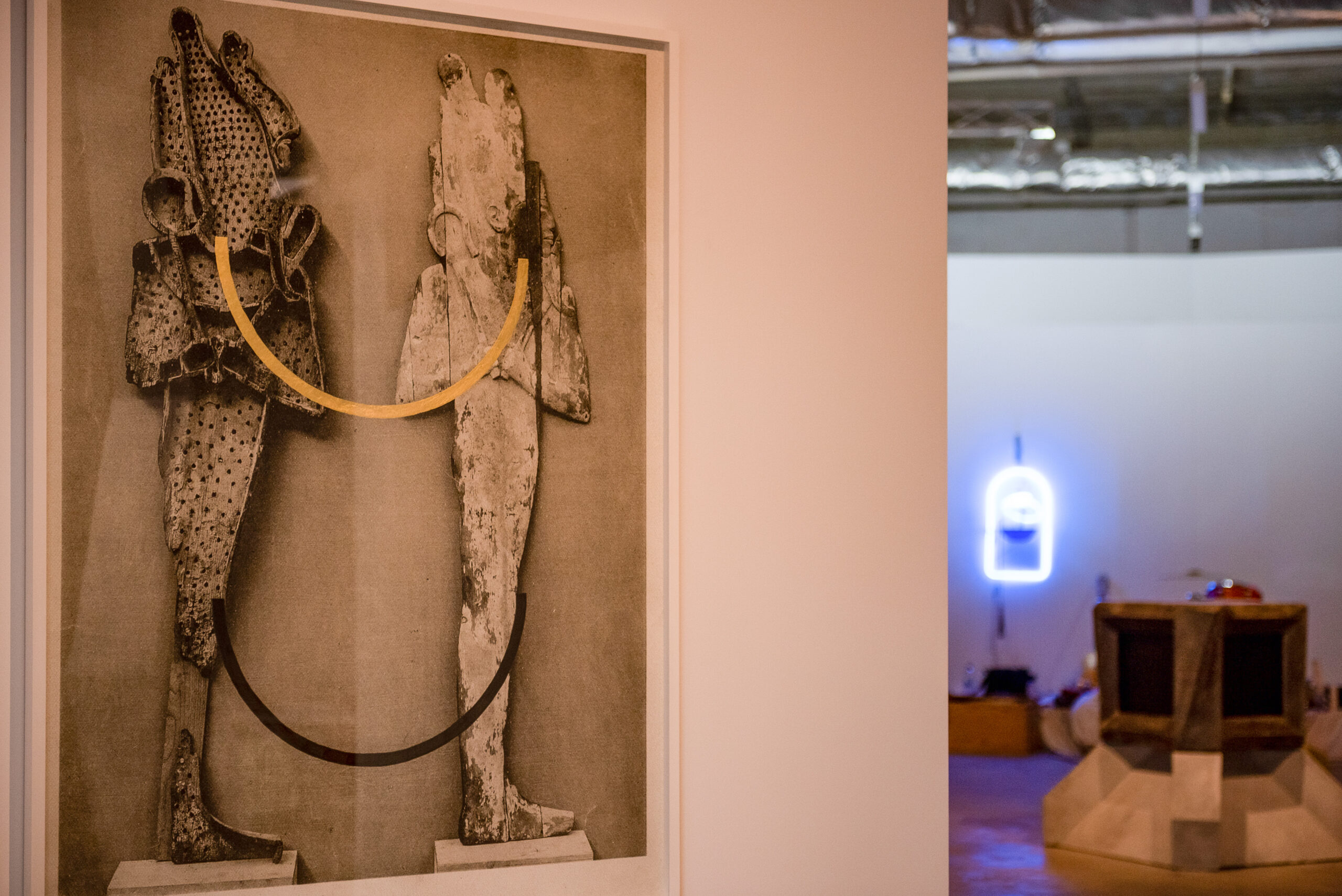 Η έκθεση είναι στημένη μέσα σε μία αρχιτεκτονική κατασκευή ενός υπερκύβου ως αναφορά στον αρχαιολογικό χώρο της Ελευσίνας, κάτι ανάμεσα σε ερείπιο που μπορεί να υπήρξε πριν από χιλιετίες αλλά και σε ένα ακαθόριστο – αποκαλυπτικό μέλλον. Ένας ιερός ναός μέσα στον οποίο ο επισκέπτης καλείται να ξεκινήσει ένα ταξίδι ανακάλυψης και αποκάλυψης, μια συμβολική μετάβαση στον Κάτω Κόσμο μετ’ επιστροφής. Τα διαφορετικά έργα τέχνης που βρίσκονται στο ιερό αυτό έδαφος εμπνέονται και απηχούν θέματα και μοτίβα των Μυστηρίων – τον κύκλο του θανάτου και της αναγέννησης, τη γονιμότητα και τη θνητότητα, τις τελετές μύησης και τις τελετουργίες, τις παραισθήσεις και τα οράματα, ενώ, παράλληλα, κυριαρχεί το αποκρυφιστικό, το σκοτεινό και το ψυχεδελικό στοιχείο.