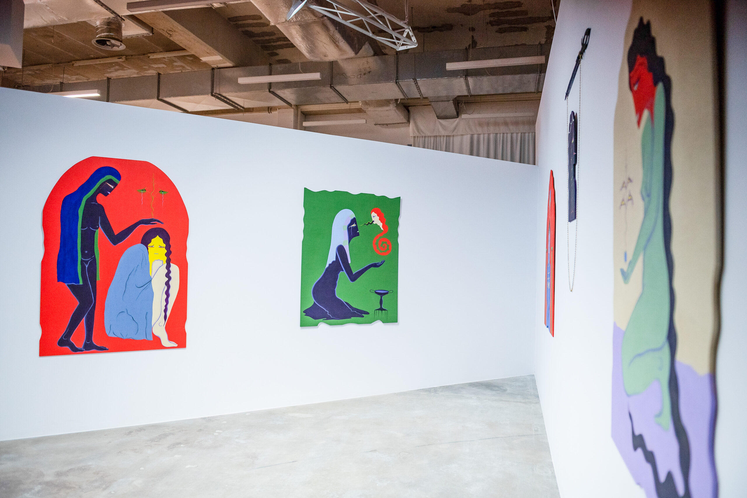 Τον επισκέπτη υποδέχεται στο χώρο το έργο Germinating Soul του Πάνου Τσαγκάρη ο φύλακας-άγγελος του ναού με τη μορφή του Οσίριδος, του θεού του Κάτω Κόσμου στην αρχαία Αίγυπτο. Το βίντεο της Serene Blumenthal με μια μασκοφορεμένη γυναίκα με αλλόκοτη ενδυμασία να επιτελεί τελετουργικές χειρονομίες – όπως οι ιέρειες των Ελευσινίων Μυστηρίων που χόρευαν όλη νύχτα – αποτελεί ένα σύγχρονο, φεμινιστικό σχόλιο στην αρπαγή της Περσεφόνης και τις αποκρουστικές πρακτικές που έχουν εφαρμοστεί στο γυναικείο σώμα κατά τη διάρκεια της ιστορίας. Στη συνέχεια της περιήγησης, η Δανάη Ανεσιάδου προσκαλεί τον επισκέπτη σε ένα υπνωτιστικό παιχνίδι σκιών που επιτελείται από δύο χέρια, ένα θέαμα από φάσματα, σαν αιθέριες αντανακλάσεις. Ο Πάνος Τσάγκαρης σχολιάζει ακόμη την ψευδαισθητική φύση του υλικού κόσμου που ζούμε με μία σειρά ζωγραφικών έργων που προκύπτουν από εφήμερες εγκαταστάσεις φτιαγμένες από καθρέφτες. Ο Joris Van de Moortel δημιουργεί πίνακες, εγκαταστάσεις, γλυπτά και ηχητικά έργα με ποικίλες αναφορές στα Ελευσίνια Μυστήρια. Στα έργα του Filip Vervaet, ένα ψυχεδελικό σπήλαιο και πύλες από νερό από όπου παράγονται τεκτονικοί ήχοι, θα μπορούσαν να αποτελούν εισόδους στον Κάτω Κόσμο. Η Kimsooja παρουσιάζει μια βουδιστική μαντάλα σε σχήμα τζουκ μποξ για να διερευνήσει τη διττή φύση της ζωής, συνδυάζοντας στοιχεία από την ανατολική και τη δυτική φιλοσοφία, ενώ η Shana Moulton απολαμβάνει το πρωινό της μέχρι τη στιγμή που χάνει τις αισθήσεις της από το ιερό ποτό κυκεώνα αλλά και τα δημητριακά Kellogg’s Special K. Τέλος, τα ζωγραφικά έργα της Lysandre Begijn που απεικονίζουν σαμανιστικές μορφές που μοιάζουν με ιέρειες από την ελληνική μυθολογία, την κρητική ή την ετρουσκική τέχνη, ολοκληρώνουν το ταξίδι του επισκέπτη στο ναό και του προσφέρουν μια ασφαλή επιστροφή στον έξω κόσμο.