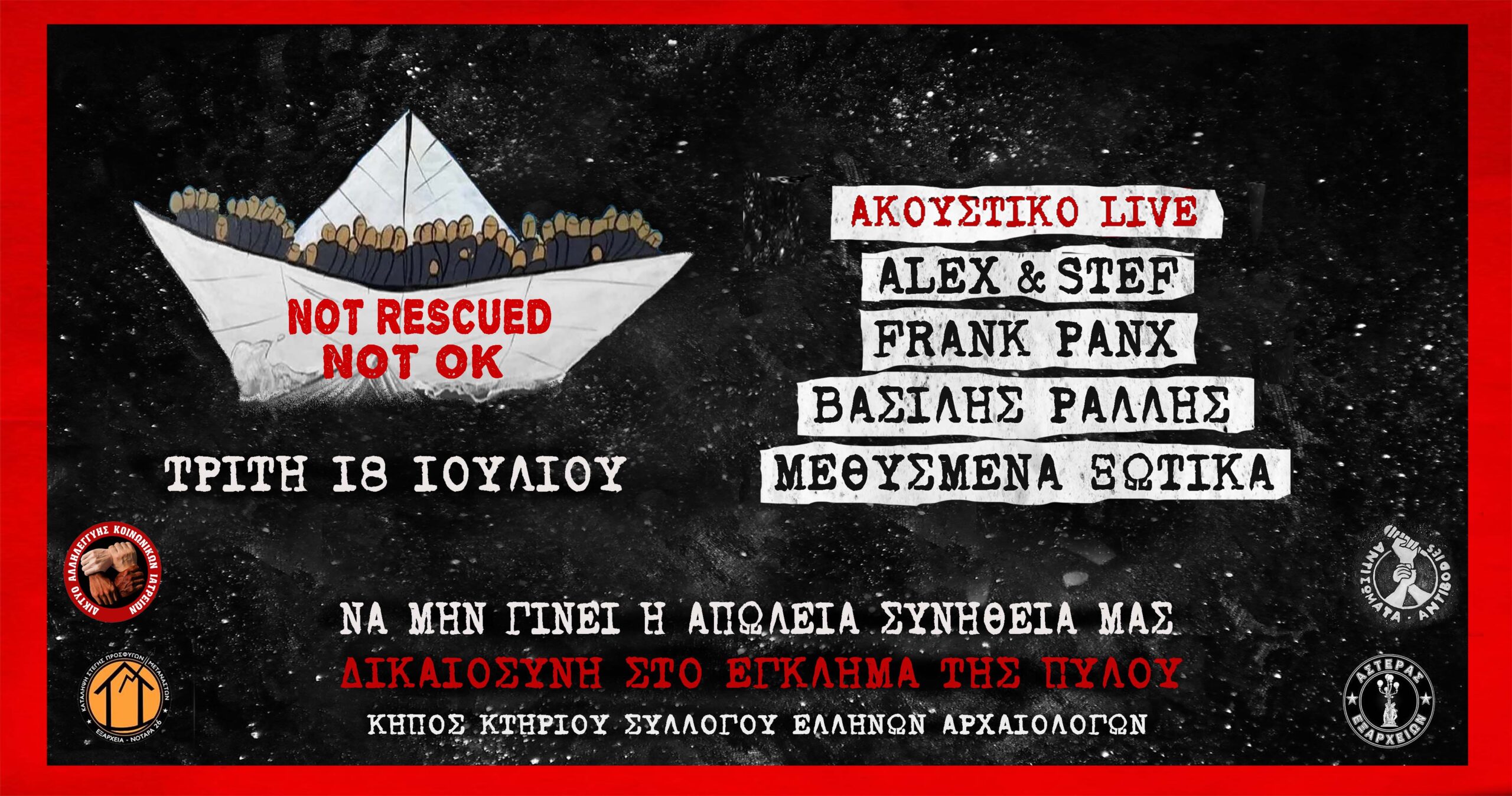 Το Δίκτυο Αλληλεγγύης Κοινωνικών Ιατρείων, οι Συλλογικές Δράσεις Κοινωνικής Αλληλεγγύης για το 18 Άνω, τα Αντισώματα, ο Αστέρας Εξαρχείων και η κατάληψη στέγης προσφύγων/σων Νοταρά, νομικοί, γιατροί, καλλιτέχνες, ενώνουμε τις δυνάμεις μας για δικαιοσύνη, για τις εκατοντάδες ψυχές που βρήκαν τραγικό θάνατο στο βυθό της Μεσογείου, κόντρα στην ανασφάλεια και τον καθημερινό φόβο που συντρίβουν ντόπιους και μετανάστες, σε μια βραδιά παρέμβαση στο κέντρο της Αθήνας.