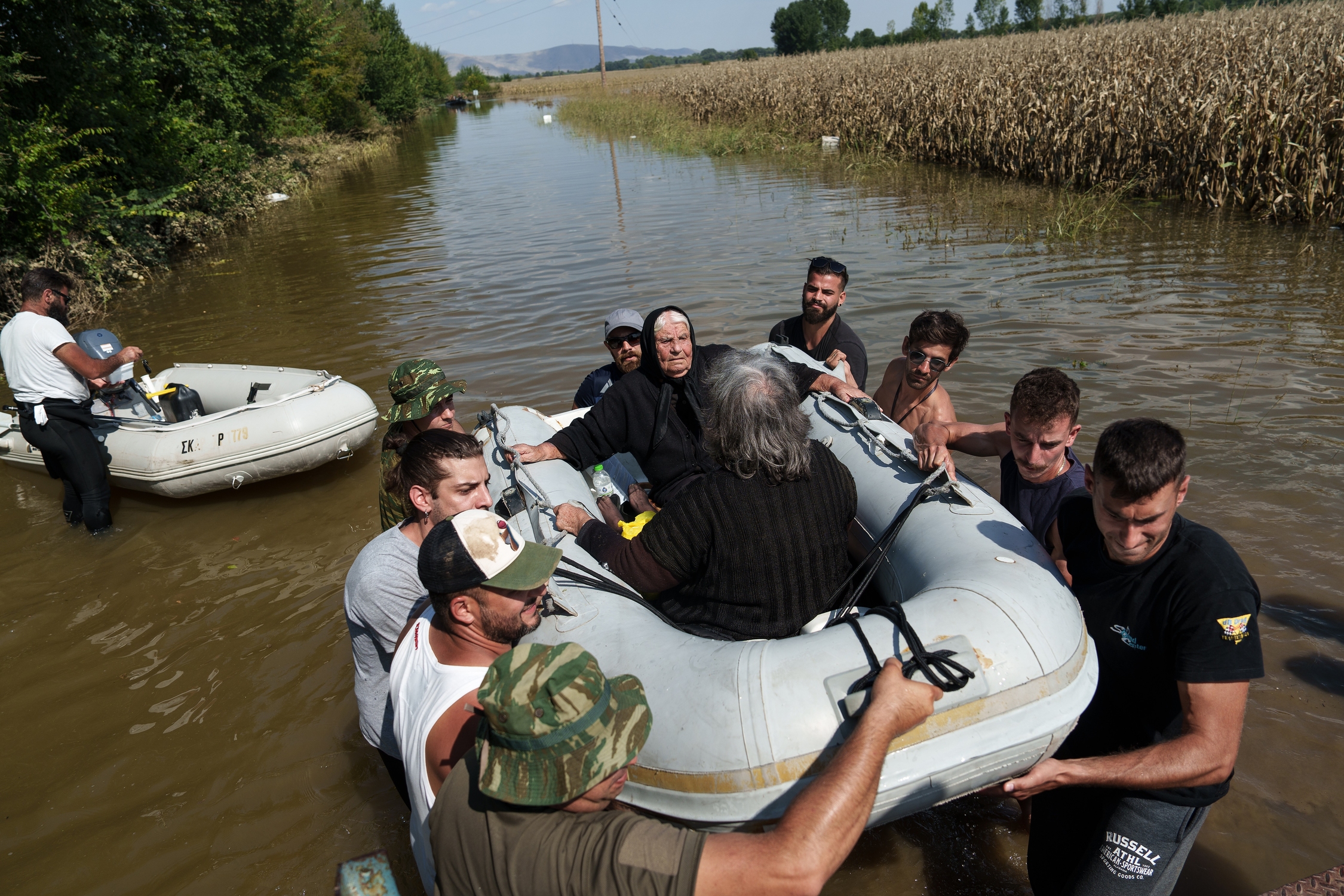 Residents of the flooded Koskinas village are rescued by boats with the help of volunteers in Karditsa, Greece on September 9, 2023. / Κάτοικοι του πλημμυρισμένου χωριού Κοσκινάς απεγκλωβίζωνται με βάρκες με τη βοήθεια εθελοντών, Καρδίτσα, 9 Σεπτεμβρίου 2023.