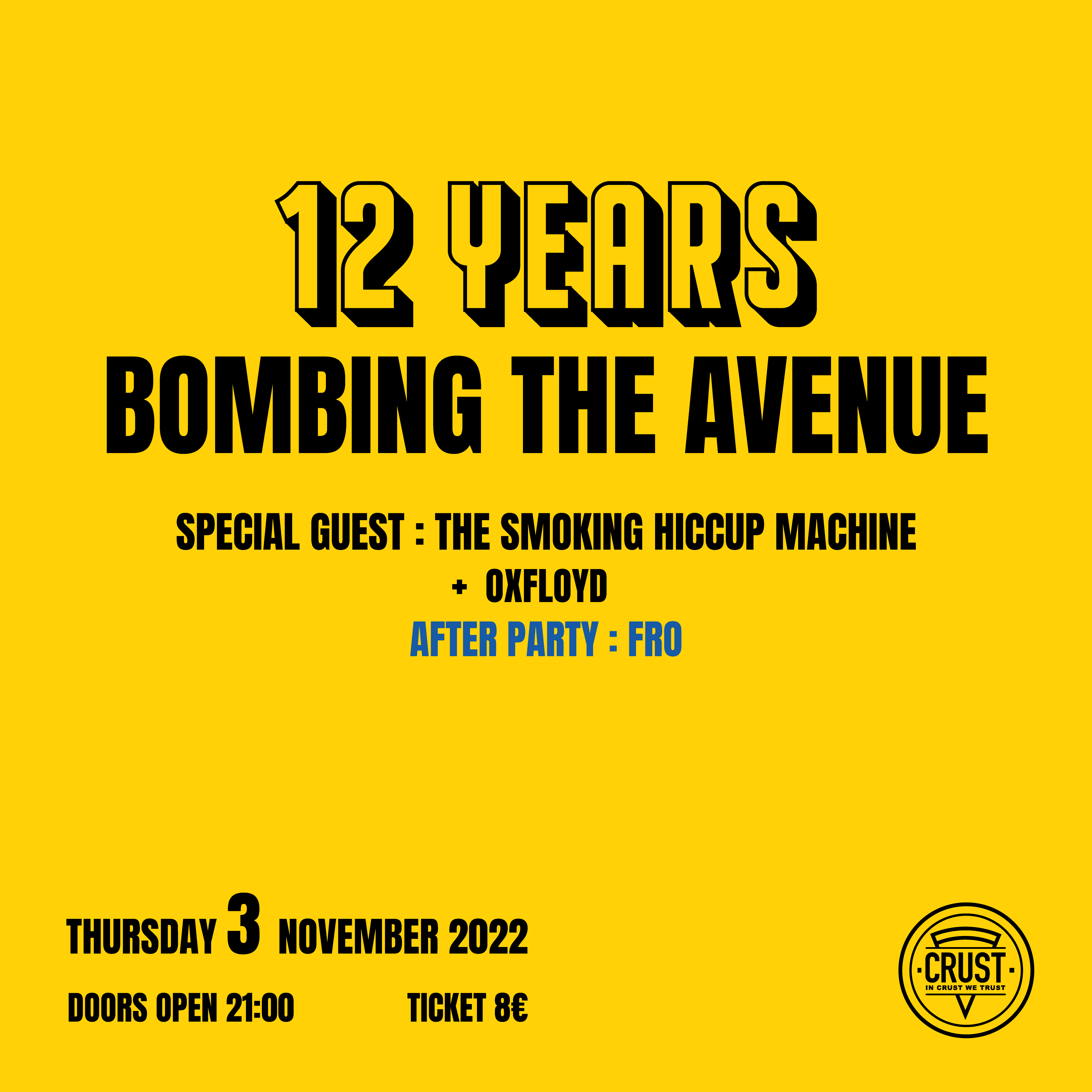 Για να γιορτάσουν τα 12 χρόνια ύπαρξης τους, οι Bombing The Avenue θα κάνουν ένα crossover ολόκληρης της δισκογραφικής δουλειάς τους μαζί με special guest που τους έχουν συνοδέψει στην πορεία τους. Μετά τις εμφανίσεις του σε διάφορα venue της Νέας Υόρκης, ο πολύ κοντινός φίλος της μπάντας Oxfloyd, θα αποτελέσει το opening act της βραδιάς. Έπειτα θα ακολουθήσουν ντόπιοι και πολυαγαπημένοι The Smoking Hiccup Machine. Το afterparty έχει αναλάβει ο γνωστός σε όλους μας FRO.