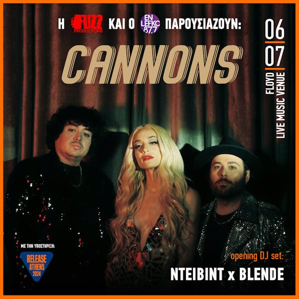 Η Fuzz Productions και ο En Lefko 87.7, με την υποστήριξη του Release Athens Festival, παρουσιάζει τους Cannons, το Σάββατο 6 Ιουλίου, στο Floyd Live Music Venue. Το τρίο της εναλλακτικής electro-pop από το Los Angeles, που τα τελευταία χρόνια γνωρίζει μεγάλη επιτυχία σε ολόκληρο τον κόσμο, έρχεται για πρώτη φορά στην Ελλάδα για ένα από τα πιο συναρπαστικά live του φετινού καλοκαιριού. Η βραδιά θα ανοίξει με ένα special b2b DJ set από τους NTEIBINT x Blende.