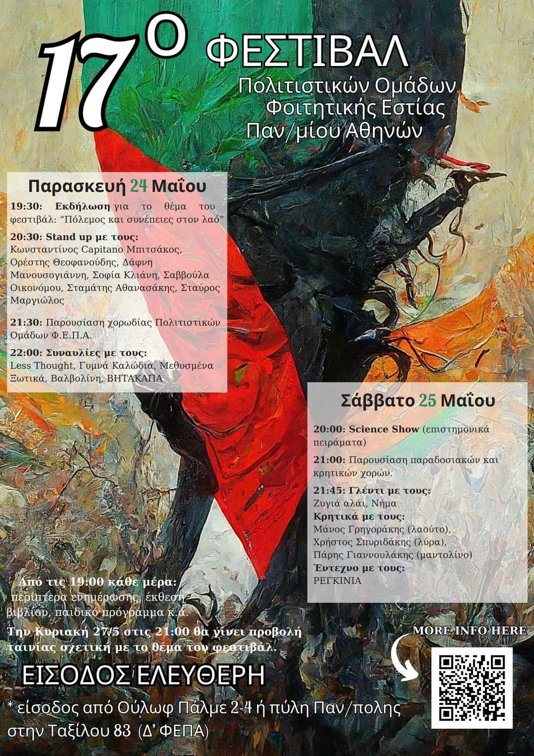 Η Τέχνη όμως δεν γίνεται σε πολιτικό κενό. Έτσι, το Φεστιβάλ των παιδιών φέτος, κι ενώ η ανθρωπότητα συγκλονίζεται από τον Πόλεμο στη Γάζα, έχει θέμα το Πόλεμο και τις Συνέπειές του στον Λαό. Θα πραγματοποιηθεί εκδήλωση και θα προβληθεί ταινία με σχετικό θέμα.