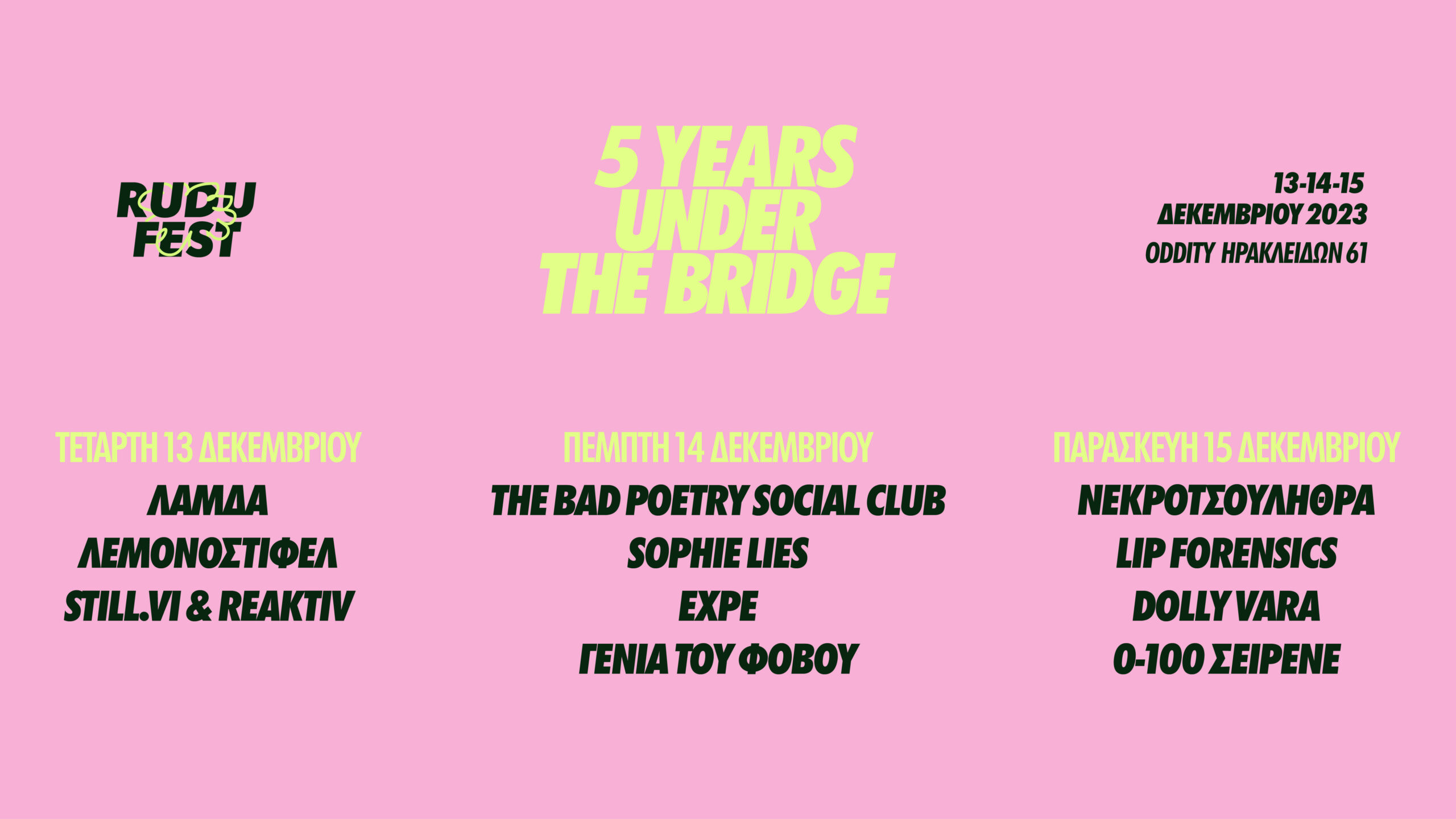 Το Rudu Bar γιορτάζει τα πέντε του χρόνια και σε συνεργασία με την “R2D2 Events & Productions” διοργανώνει το Rudu Fest “5 Χρόνια Κάτω Απ’ Τη Γέφυρα” στον πολυχώρο του Oddity Club.