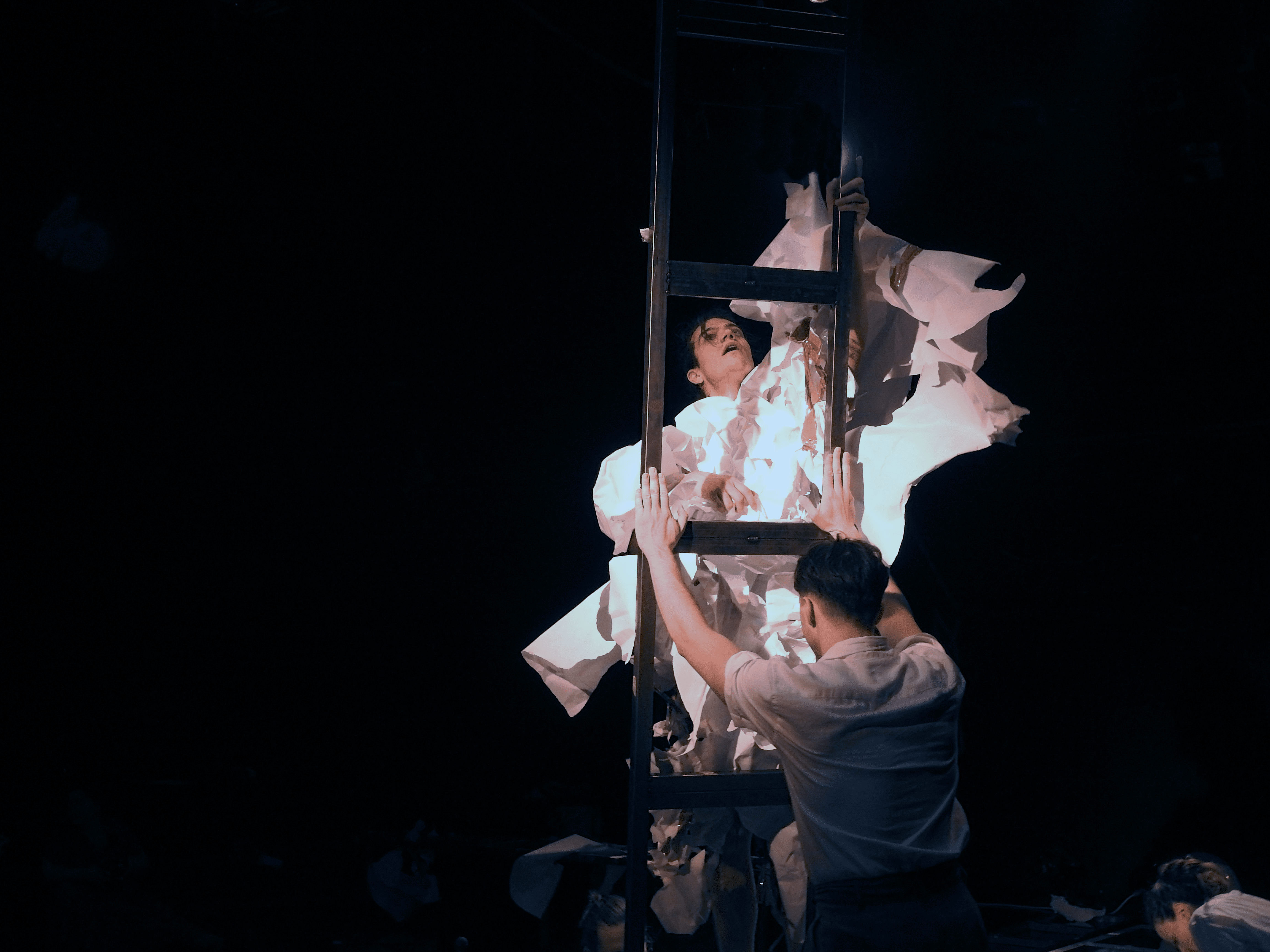 Με αφορμή τις Βάκχες του Ευριπίδη και τον Σπαραγμό της Μαργαρίτας Λυμπεράκη, πέντε επι σκηνής πρόσωπα θα επιχειρήσουν να συντηρήσουν έναν κόσμο φτιαγμένο από χαρτί. Η παράσταση θα προσπαθήσει να αφηγηθεί την ιστορία του μυθικού βασιλιά Πενθέα ή αλλιώς εκείνου που εμείς ονομάζουμε – ‘’ο άνθρωπος των θλίψεων’’.
