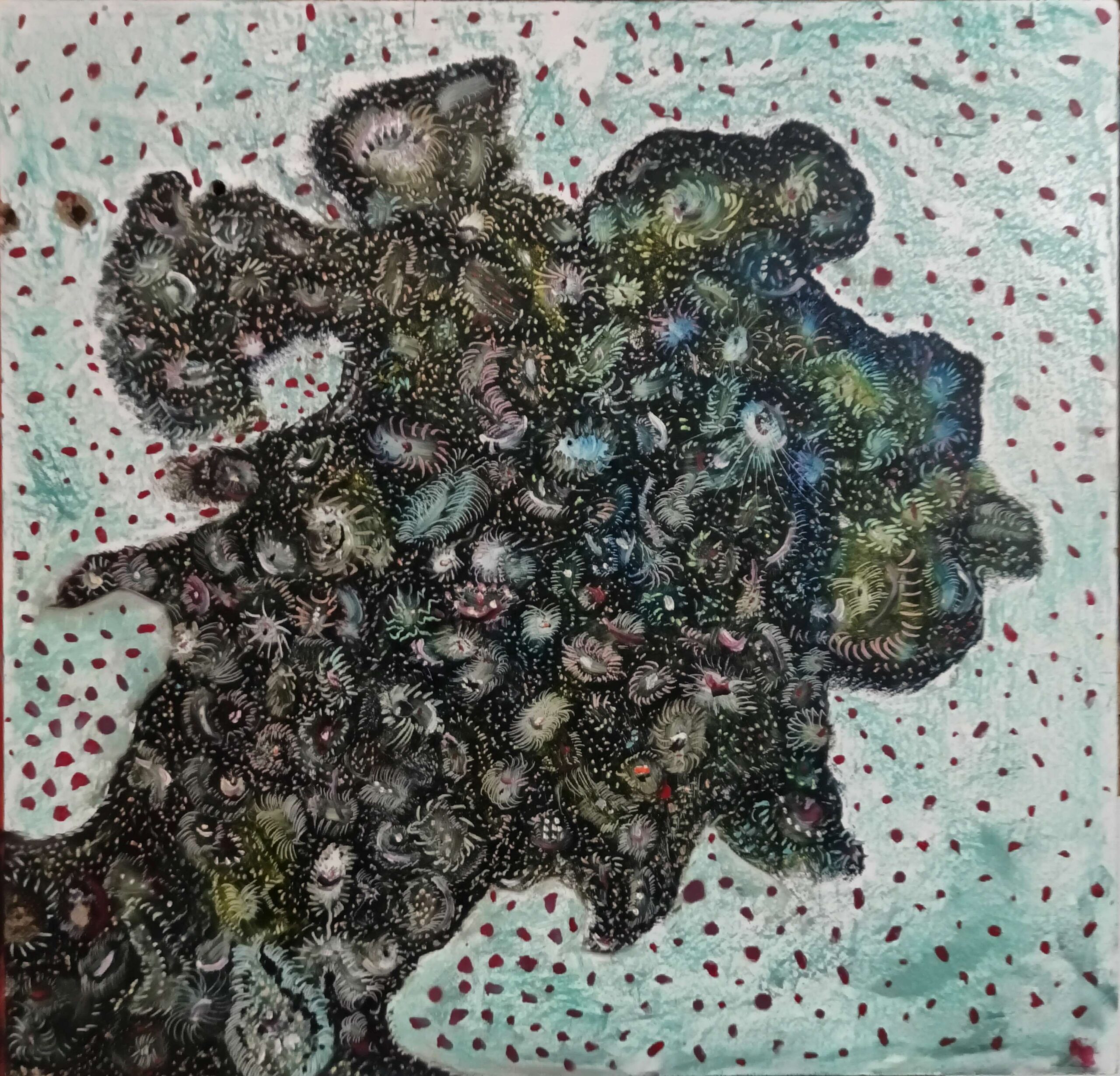 Στην ατομική του έκθεση «Το Ποιητικό Κράτος» στο Λόφος Art Project, ο Ρακάς δουλεύει κυρίως σε επανακτημένες ξύλινες επιφάνειες – παλιές πόρτες, κομμάτια επίπλων, απορρίμματα της καθημερινής καταστροφής. Αυτή η επιλογή δεν είναι διακοσμητική· λειτουργεί σαν υλική μνήμη. Το ξύλο κουβαλάει ήδη βιωμένες ματιέρες, ρωγμές, ίχνη φθοράς – όπου πάνω τους ο Ρακάς ζωγραφίζει ρέουσες δομές και μορφές που μοιάζουν να έχουν ξεπηδήσει από την «επόμενη μέρα» της κατάρρευσης του κόσμου, όπου με την αναγεννητική δύναμη της φύσης, η ζωή επανέρχεται στη Γη.
