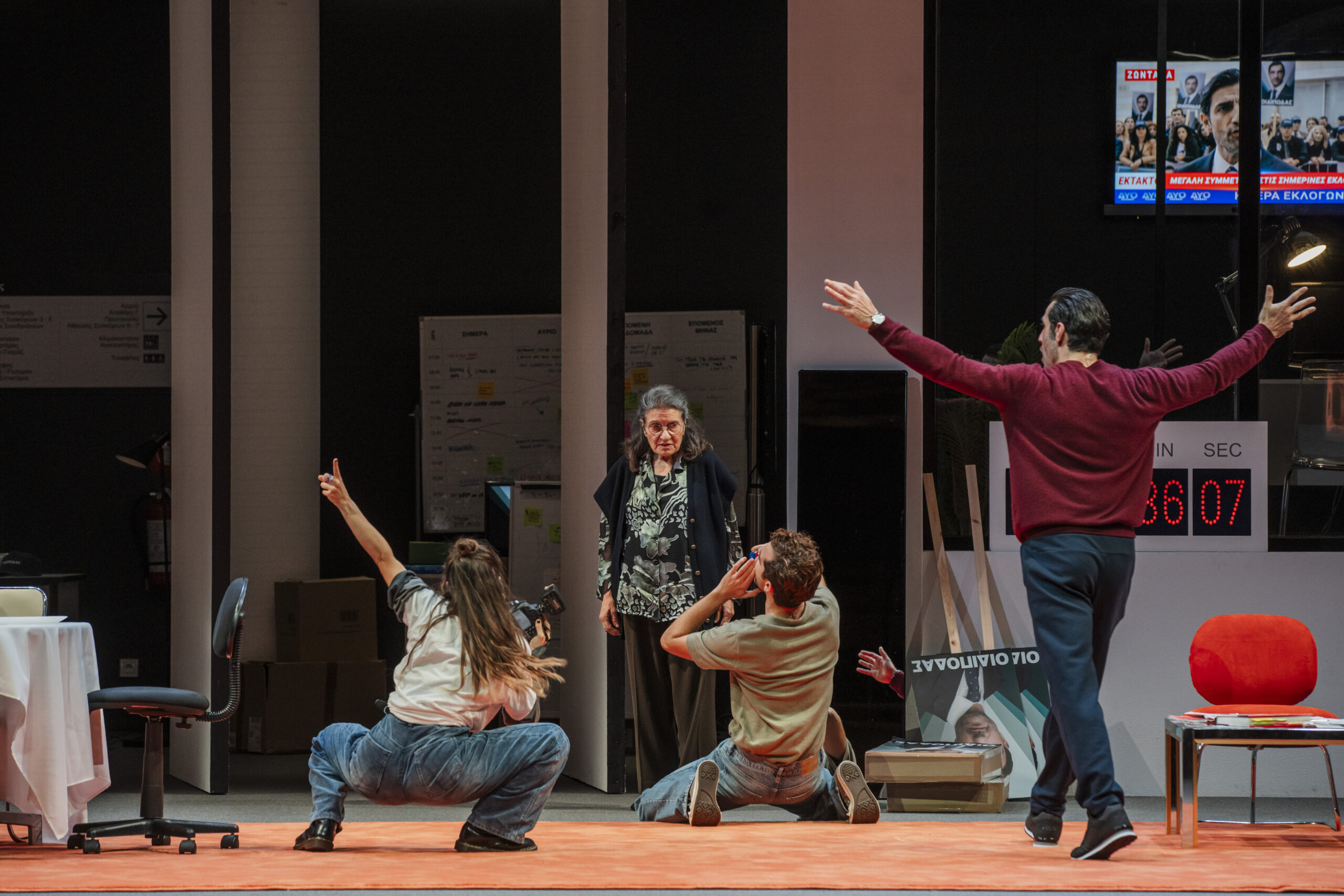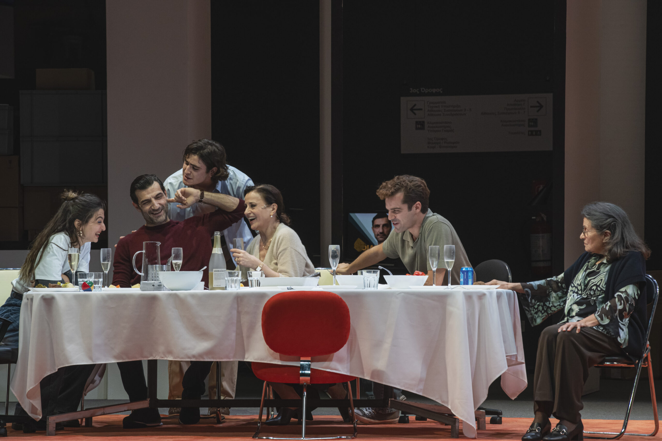 Με τον Νίκο Κουρή και την Καρυοφυλλιά Καραμπέτη στους ρόλους του Οιδίποδα και της Ιοκάστης, τον Λάζαρο Γεωργακόπουλο ως Κρέοντα και τη Ράνια Οικονομίδου ως Μερόπη (ένα πρόσωπο που εισάγει ο Άικ στο έργο) αλλά και τους Κώστα Νικούλι, Σωκράτη Πατσίκα, Τάκη Σακελλαρίου, Χαρά Γιώτα, Γιώργο Ζιάκα, Γιάννη Τσουμαράκη και Δανάη-Αρσενία Φιλίδου να συγκροτούν ένα τραπέζι μιας οικογενειακής και πολιτικής συνάθροισης που εκτρέπεται οριστικά. Σε μετάφραση στα ελληνικά από τον Νίκο Χατζόπουλο, σκηνοθετική επιμέλεια ελληνικής παραγωγής τη Lizzie Manwaring και συνεργάτη σκηνοθέτη τον Πρόδρομο Τσινικόρη, φορτισμένη με πολιτική, κοινωνική και υπαρξιακή ένταση, μια ηλεκτρισμένη εκδοχή του μύθου του Οιδίποδα.