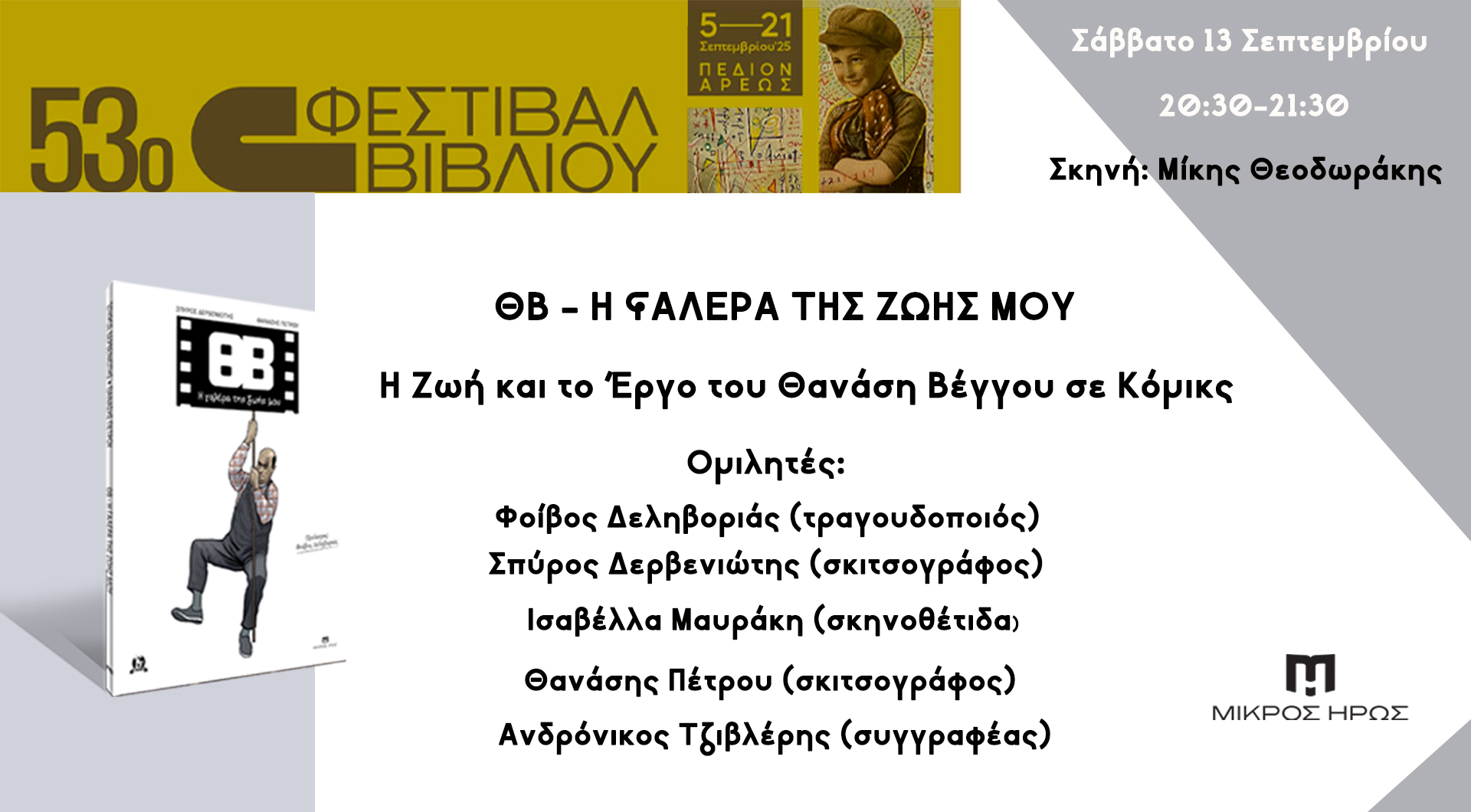 Ο τραγουδοποιός Φοίβος Δεληβοριάς, η σκηνοθέτιδα Ισαβέλλα Μαυράκη και ο συγγραφέας Ανδρόνικος Τζιβλέρης συναντούν τους δημιουργούς κόμικς Θανάση Πέτρου και Σπύρο Δερβενιώτη στο Πεδίον του Άρεως το Σάββατο 13 Σεπτεμβρίου και ώρα 20:30 στη σκηνή Μίκης Θεοδωράκης, με αφορμή το best-seller graphic novel του έτους, ΘΒ – Η γαλέρα της ζωής μου!