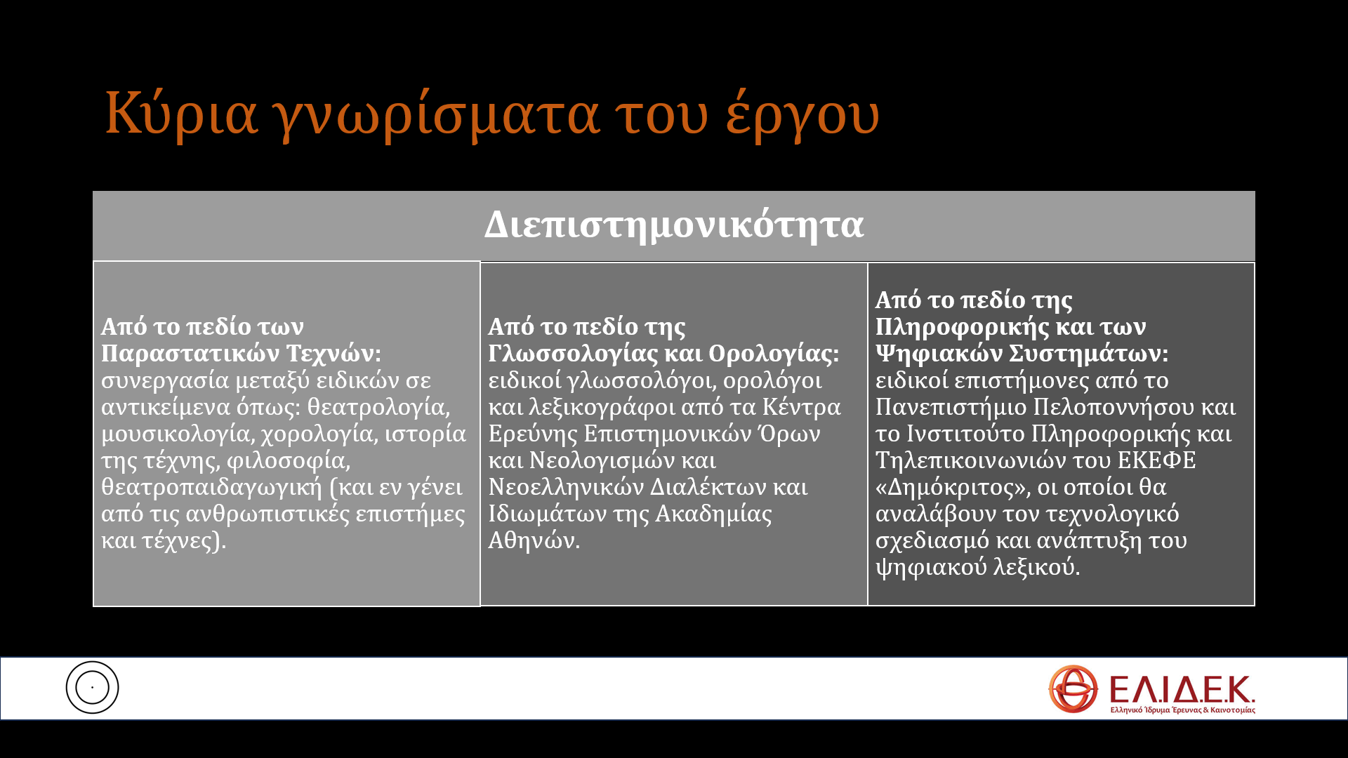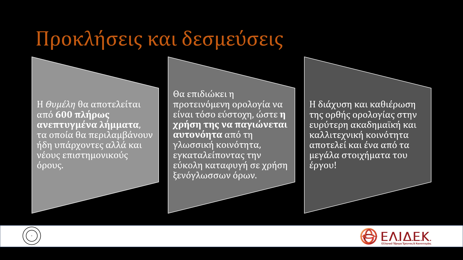 Την απάντηση φιλοδοξεί να δώσει η «Θυμέλη», ένα νέο ερευνητικό έργο, χρηματοδοτούμενο από το Ελληνικό Ίδρυμα Έρευνας και Καινοτομίας (ΕΛ.ΙΔ.Ε.Κ.), στο πλαίσιο της Δράσης «Χρηματοδότηση της Βασικής Έρευνας (Οριζόντια υποστήριξη όλων των Επιστημών)», Υποδράση 2. Το έργο αυτό αποσκοπεί στη δημιουργία ενός καινοτόμου πολυμεσικού Λεξικού για τις Παραστατικές Τέχνες. Πρόκειται για ένα βασικό εργαλείο υποδομής, διαδικτυακά προσβάσιμο, το οποίο θα περιέχει περισσότερα από 600 λήμματα.