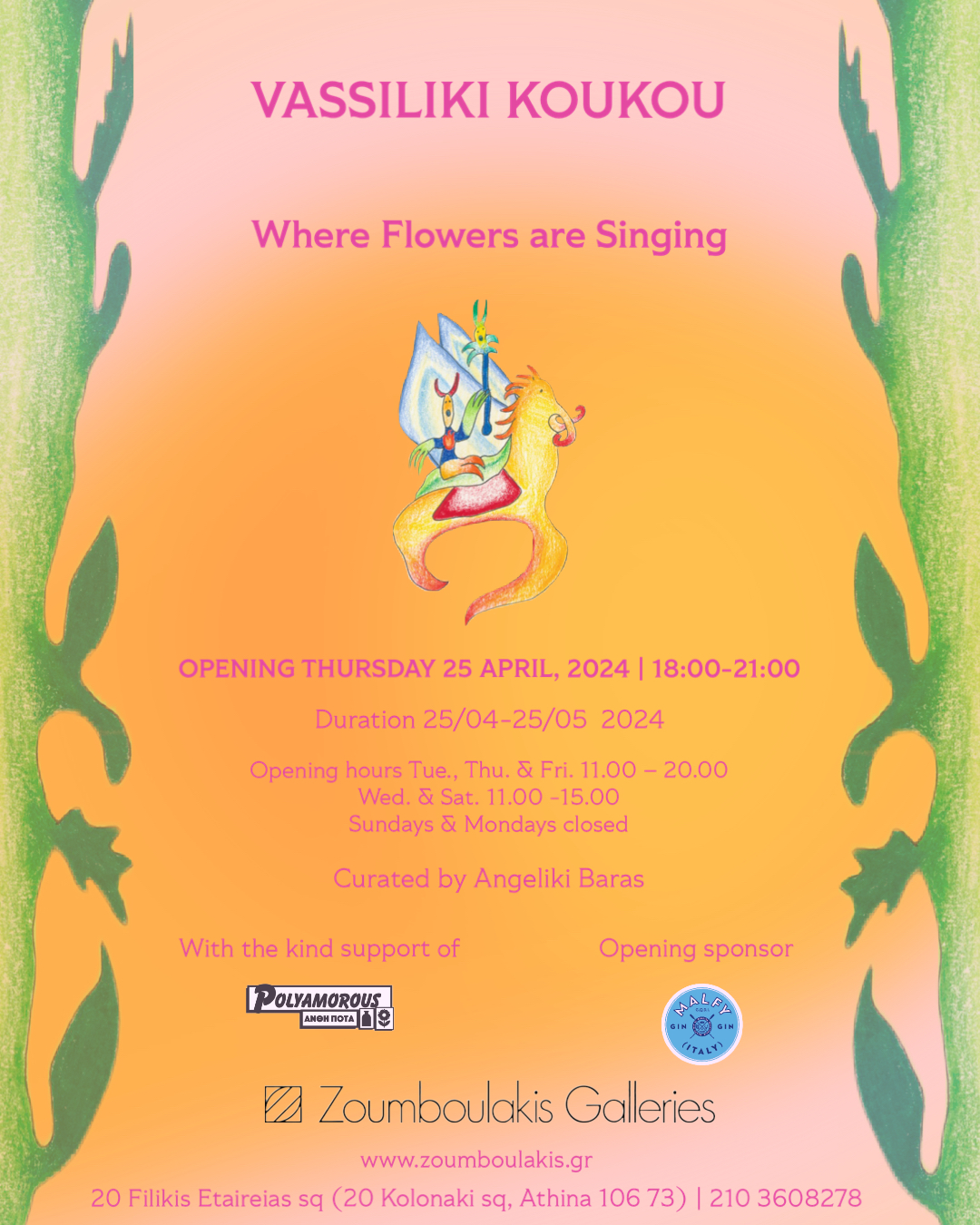 Η Γκαλερί Ζουμπουλάκη παρουσιάζει την ατομική έκθεση της Βασιλικής Κούκου, με τίτλο “Where flowers are singing”, που εγκαινιάζεται την Πέμπτη 25 Απριλίου 2024, σε επιμέλεια της Αγγελικής Μπάρα.