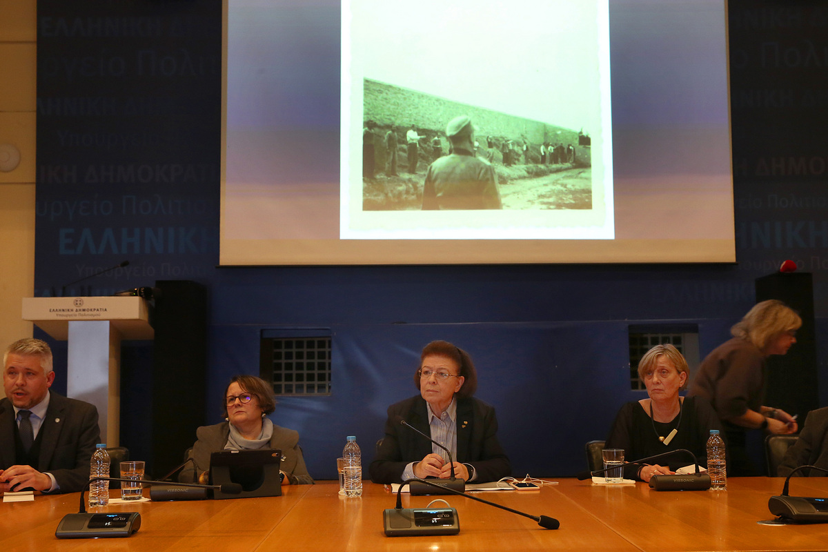 Η υπουργός Πολιτισμού Λίνα Μενδώνη (Κ), πλαισιωμένη από τους συνεργάτες της, παρουσιάζει μέρος των φωτογραφιών του ναζί αξιωματικού Χόιερ που φωτογράφισε, μεταξύ άλλων, την εκτέλεση των 200 αγωνιστών πατριωτών που εκτελέστηκαν την Πρωτομαγιά του 1944 στο Σκοπευτήριο της Καισαριανής, Αθήνα Πέμπτη 5 Μαρτίου 2026. ΑΠΕ-ΜΠΕ/ΑΠΕ-ΜΠΕ/ΟΡΕΣΤΗΣ ΠΑΝΑΓΙΩΤΟΥ