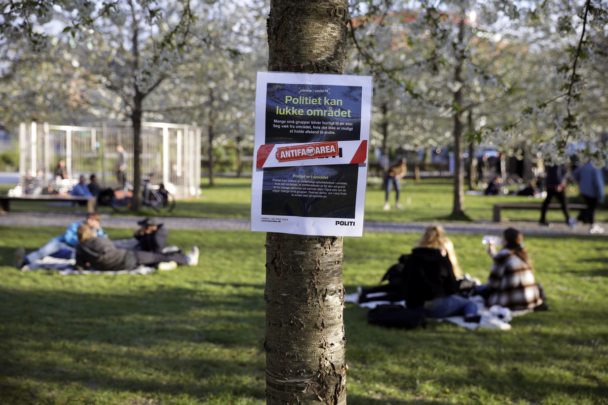 epa08382787 East Jutland Police have posted a warning sign reading 'Police can shut down this area' at Moelleparken in Aarhus, Denmark, 24 April 2020. In several parts of Denmark, police have erected signs to prevent people from gathering with more than ten people amid the ongoing coronavirus COVID-19 pandemic. Countries worldwide increased their measures to prevent the widespread of the SARS-CoV-2 coronavirus which causes the COVID-19 disease. EPA/MIKKEL BERG PEDERSEN DENMARK OUT