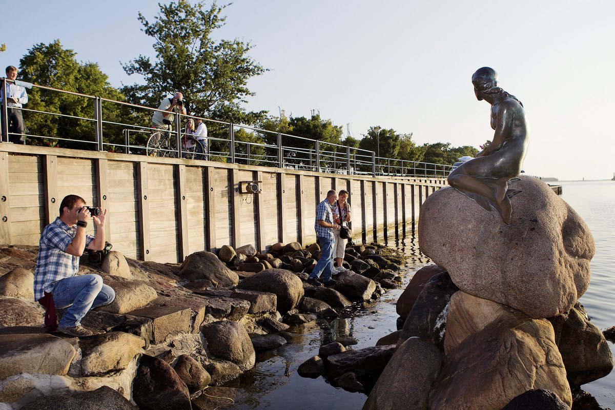 epa03834216 Copenhagen's famous Little Mermaid has her birthday photo taken by tourists at Langelinie, just north of the capital early 23 August 2013. The country's biggest attraction,created by Danish sculptor Edward Eriksen, celebrates her 100th birthday. The world famous statue is inspired by the the fairytale "The Little Mermaid" written by H.C. Andersen in 1837. EPA/Nils Meilvang DENMARK OUT